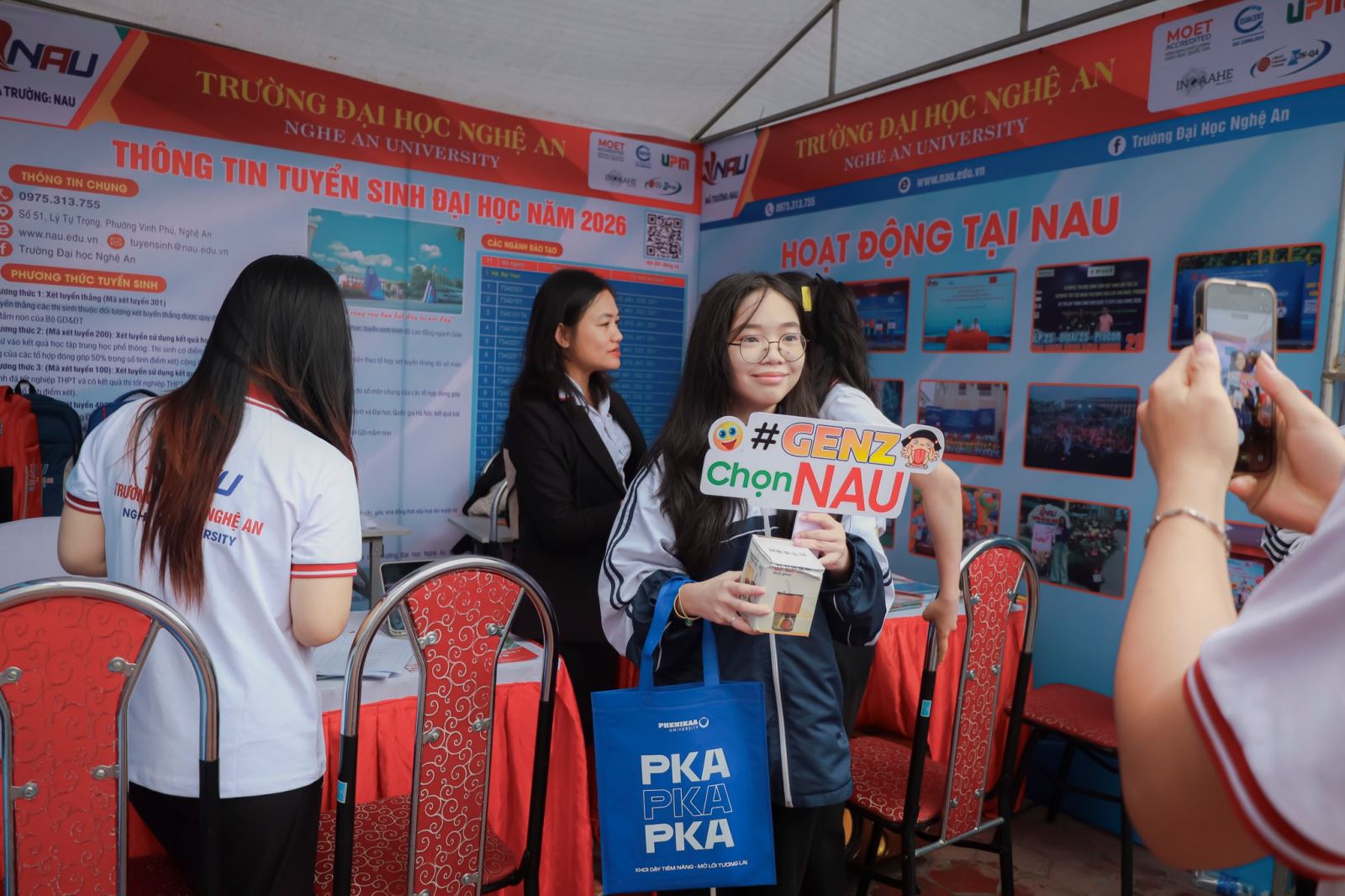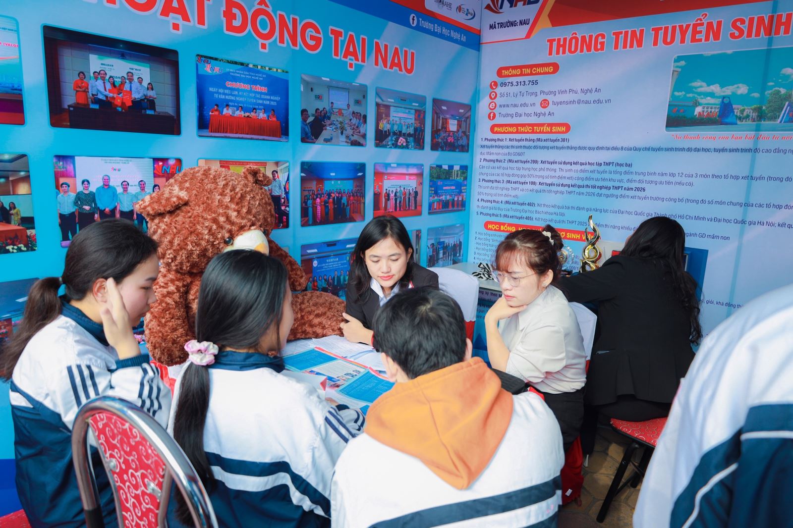 Đội ngũ tư vấn của Nhà trường đã trực tiếp trao đổi, giải đáp tận tình các câu hỏi của học sinh và phụ huynh, giúp các em hiểu rõ hơn về lộ trình học tập, định hướng nghề nghiệp và những lợi thế khi lựa chọn học tập tại Trường Đại học Nghệ An.