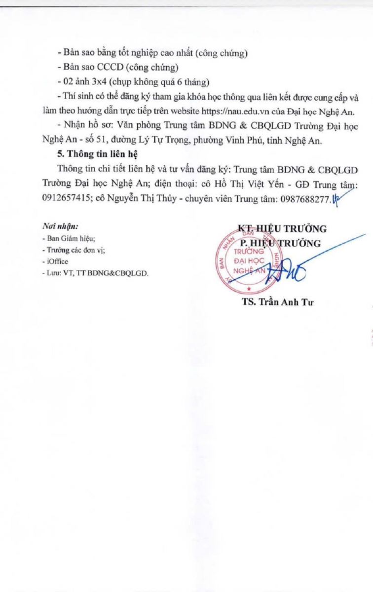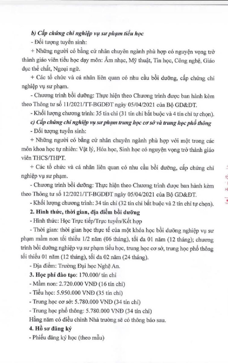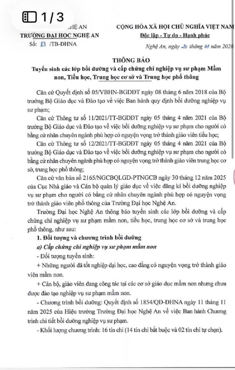 Trường Đại học Nghệ An Thông báo Tuyển sinh các lớp bồi dưỡng và cấp chứng chỉ nghiệp vụ sư phạm Mầm non, Tiểu học, Trung học cơ sở và Trung học phổ thông. 20/01/2026 08:41 191 lượt xem