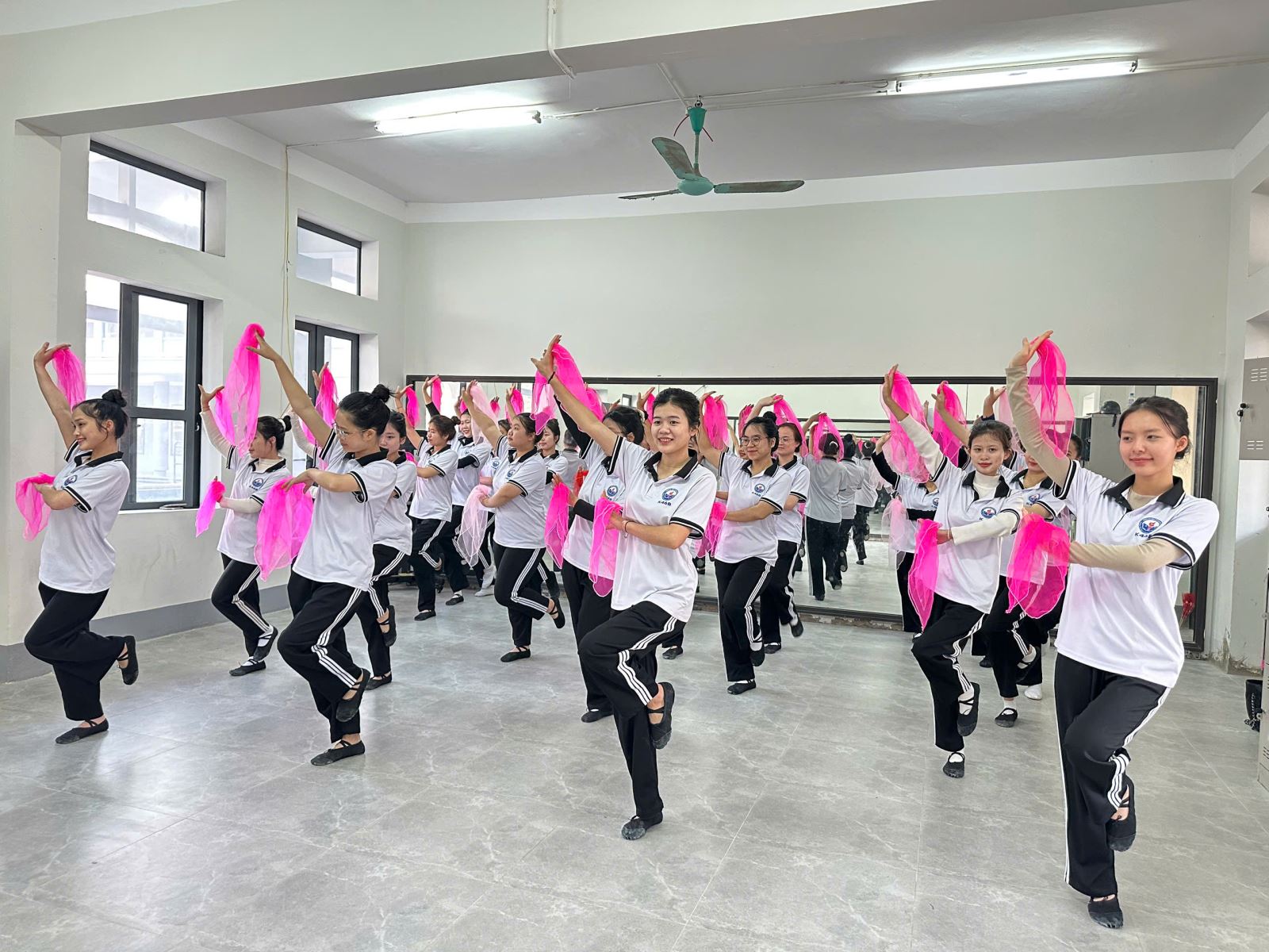 Hình ảnh ghi nhận tại giờ học đầu tuần của tập thể K46 cho thấy tinh thần học tập nghiêm túc và say mê. Những dải lụa hồng bay bổng trong không gian gương soi hiện đại không chỉ tạo nên một bức tranh đẹp, mà còn minh chứng cho sự nỗ lực không ngừng của các em trong việc hoàn thiện kỹ năng nghề nghiệp.