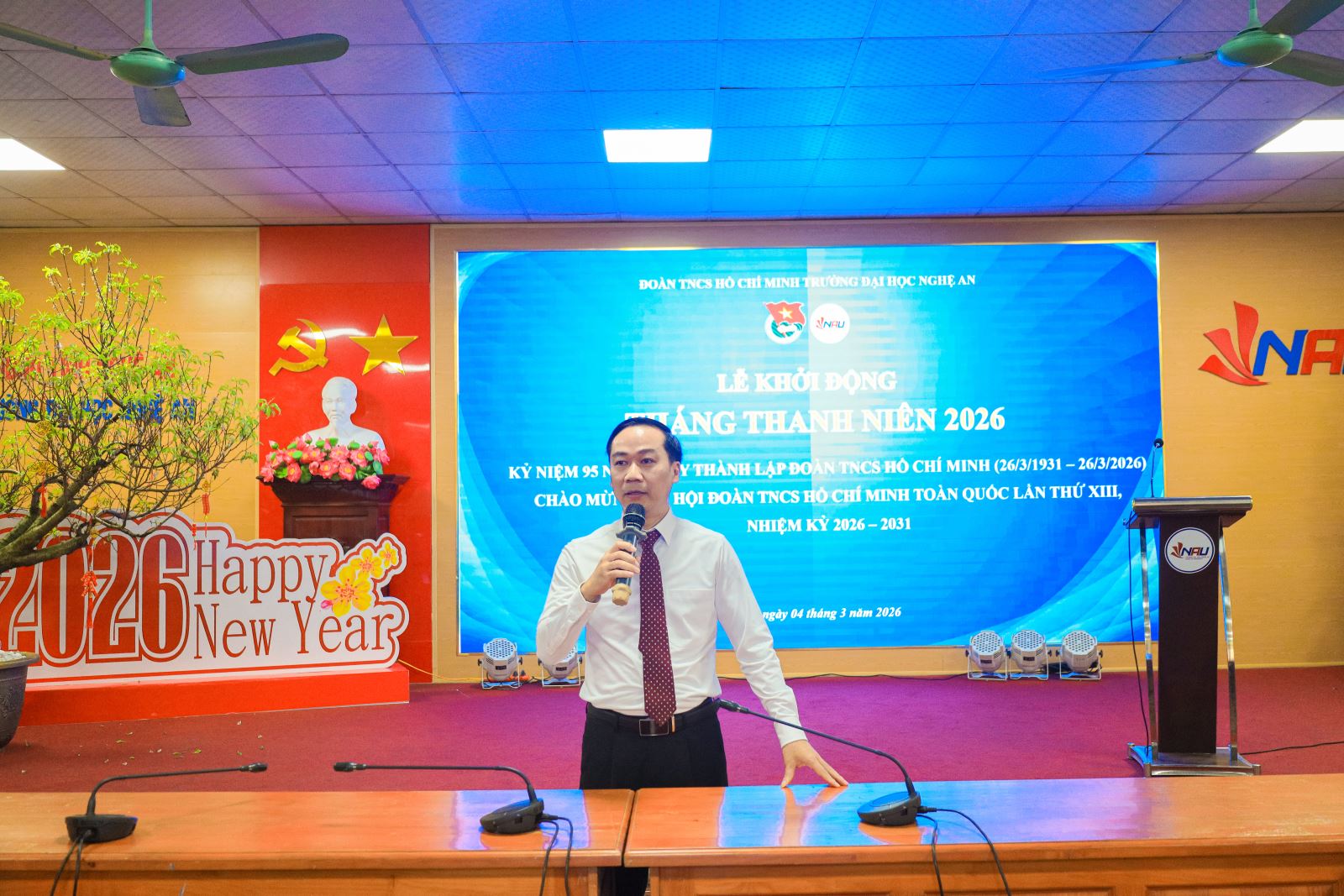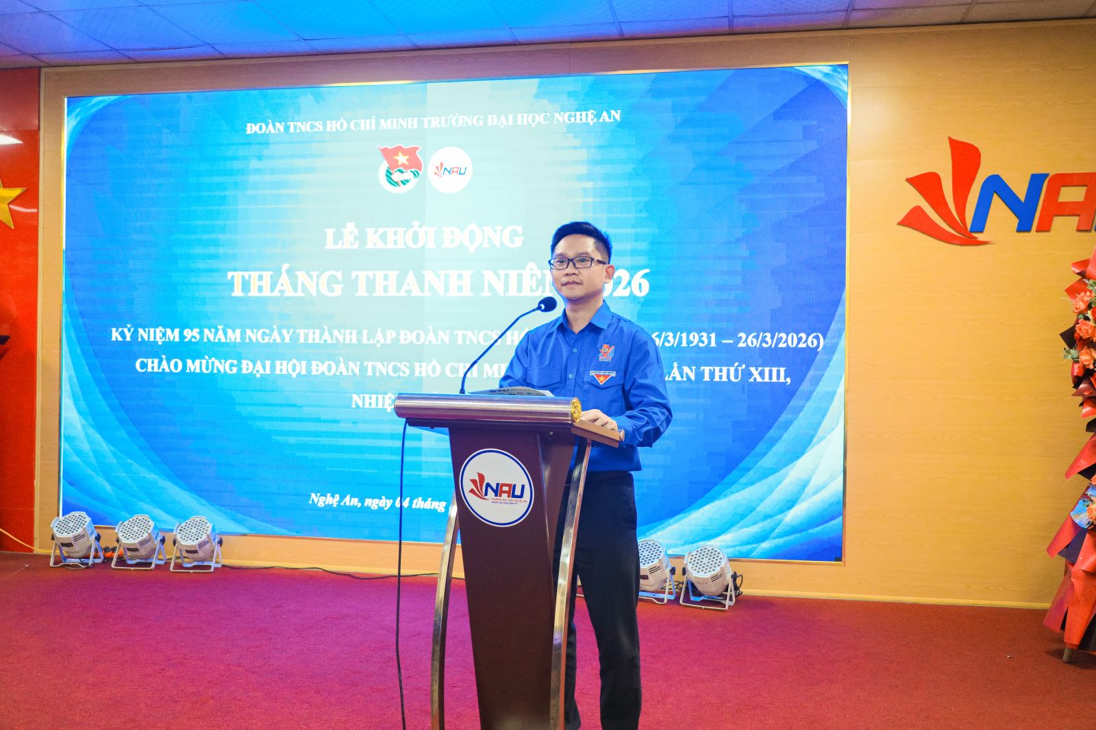 Sáng ngày 03/3/2026, tại Hội trường A2, Đoàn TNCS Hồ Chí Minh Trường Đại học Nghệ An (NAU) đã long trọng tổ chức Lễ phát động Tháng Thanh niên năm 2026, mở đầu cho chuỗi hoạt động sôi nổi của tuổi trẻ nhà trường hướng tới kỷ niệm 95 năm Ngày thành lập Đoàn TNCS Hồ Chí Minh (26/3/1931 – 26/3/2026).
