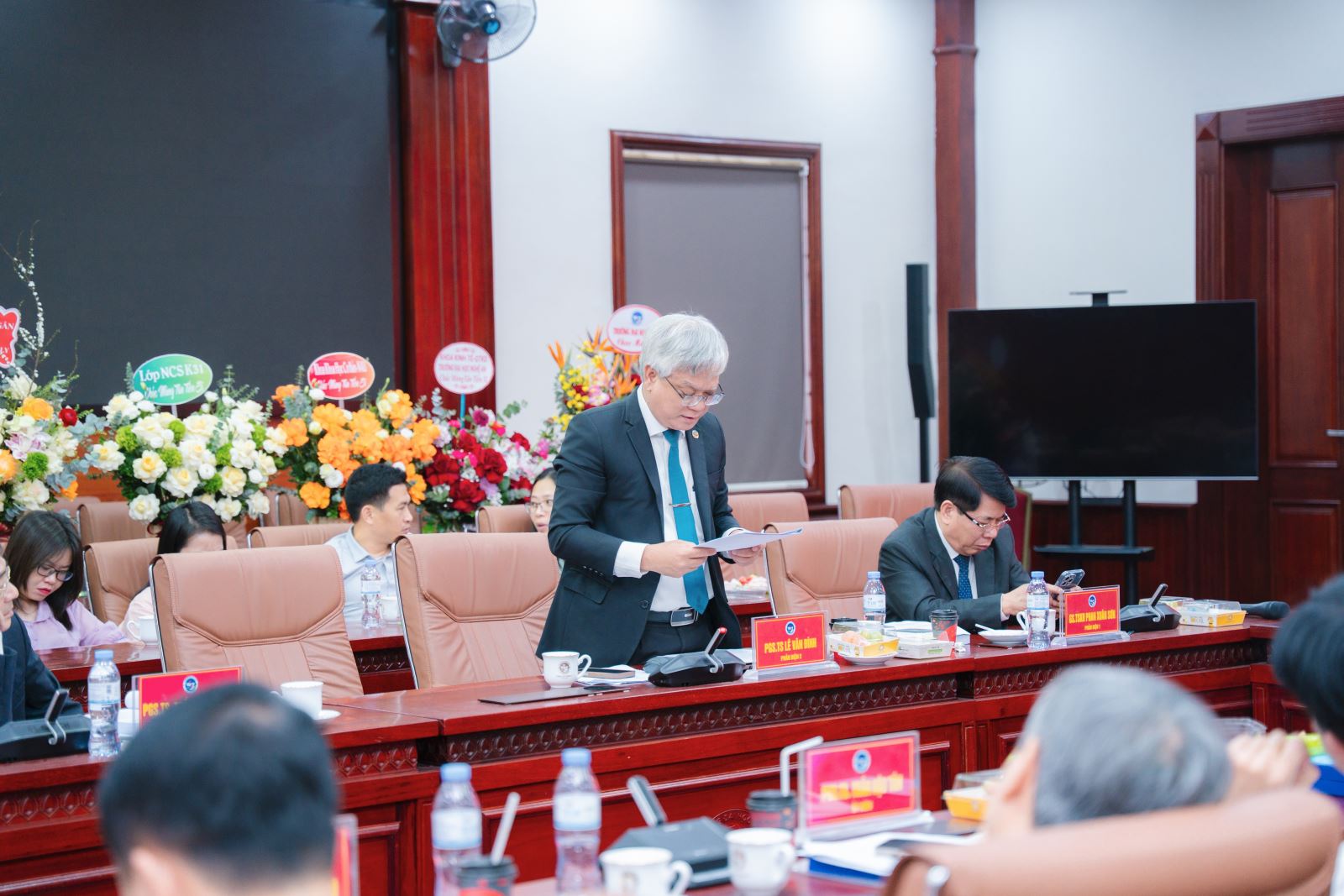 TS. Trương Quang Ngân - Phó Hiệu trưởng Trường Đại học Nghệ An phát biểu chúc mừng NCS Nguyễn Khánh Ly