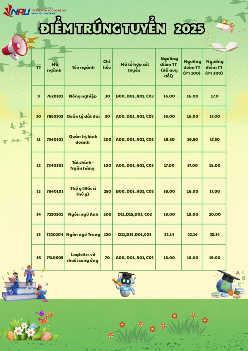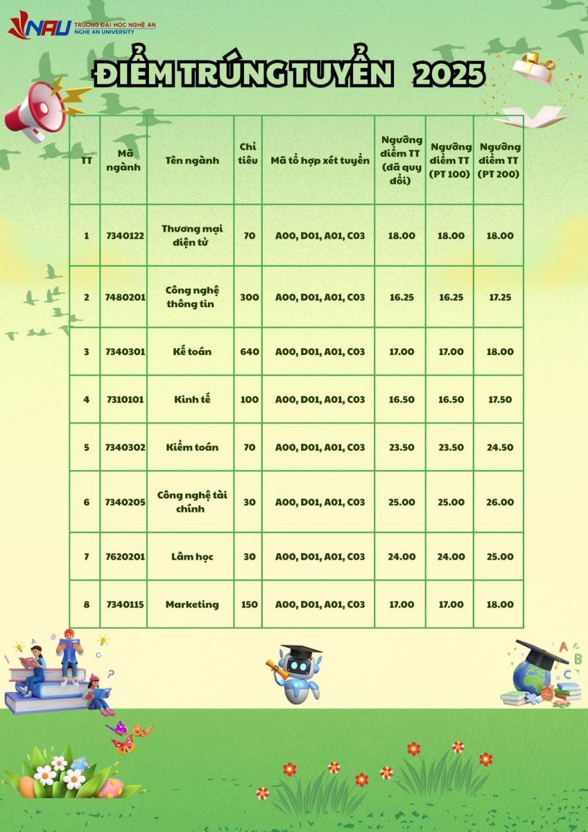 Trường Đại học Nghệ An (NAU) chính thức công bố điểm trúng tuyển hệ đại học chính quy năm 2025 – đợt 1 cho 16 ngành đào tạo.