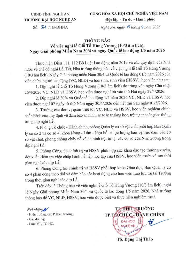THÔNG BÁO NGHỈ LỄ GIỖ TỔ HÙNG VƯƠNG (10/3 ÂL), NGÀY GIẢI PHÓNG MIỀN NAM 30/4; QUỐC TẾ LAO ĐỘNG 01/5 24/04/2026 10:45 24 lượt xem