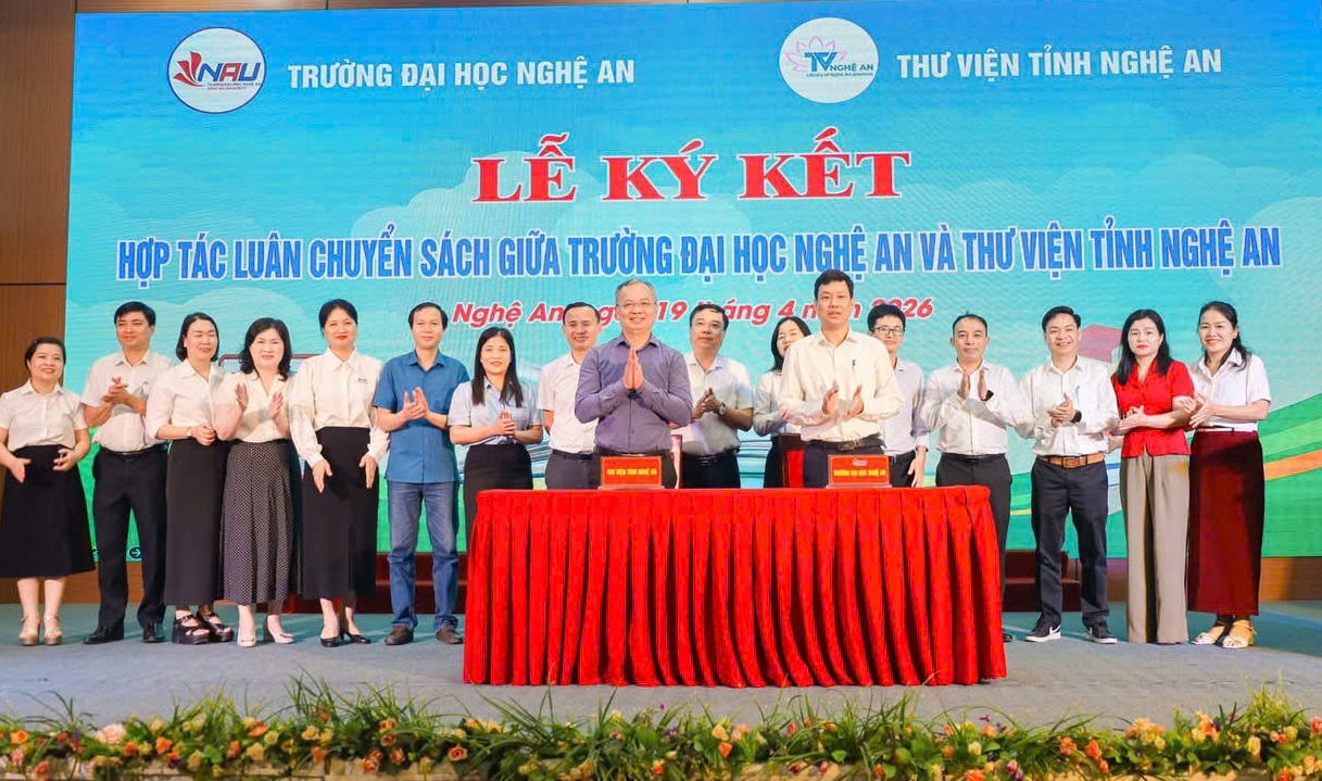 Điểm nhấn quan trọng của sự kiện là Lễ ký kết hợp tác giữa Trường Đại học Nghệ An và Thư viện tỉnh Nghệ An. Hai đơn vị cam kết phối hợp toàn diện trong việc phát triển tài nguyên số, tổ chức hoạt động văn hóa đọc, hỗ trợ nghiên cứu khoa học và mở rộng không gian học tập mở. Dịp này, Thư viện tỉnh cũng đã trao tặng nhiều đầu sách giá trị cho Nhà trường.