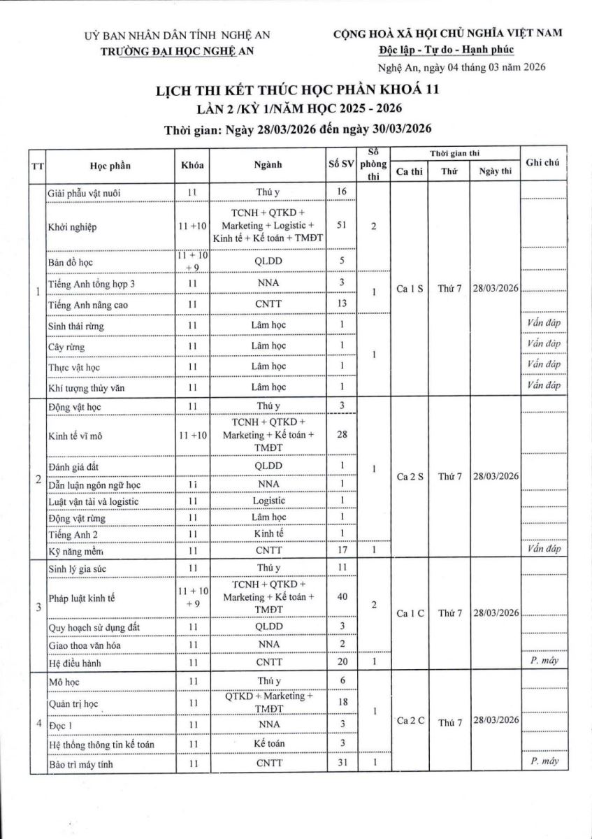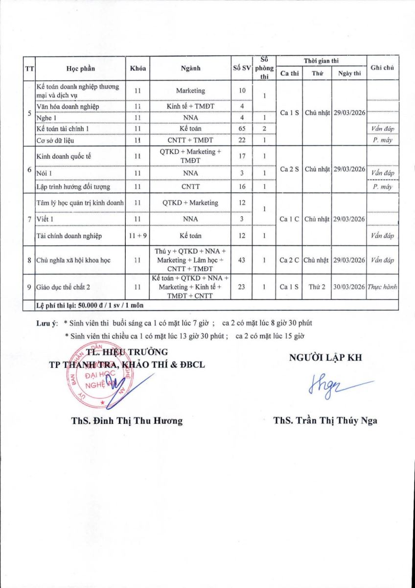 Lịch thi kết thúc học phần Khóa 9, Khóa 10 lần 2/kỳ 1/ năm học 2025-2026