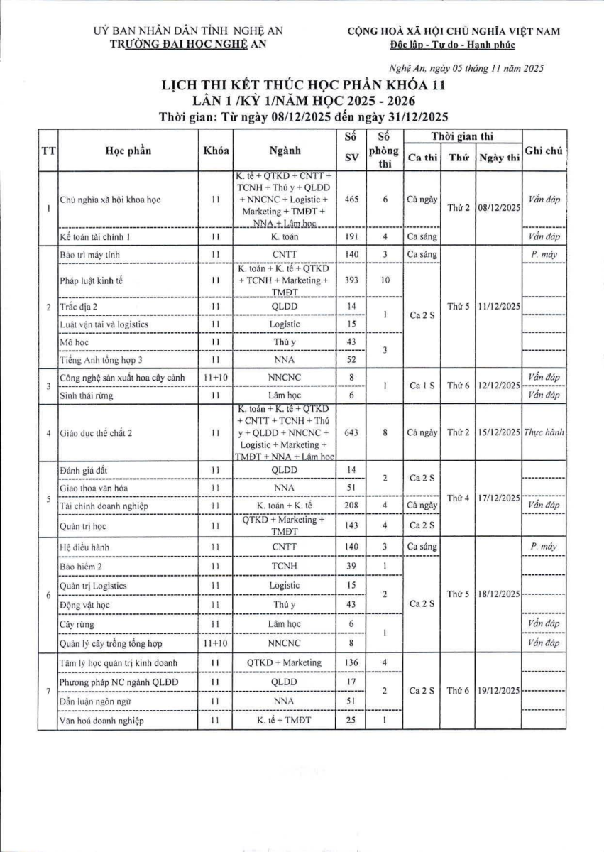 Lịch thi kết thúc học phần Khóa 11 lần 2, kỳ 2, năm học 2024-2025