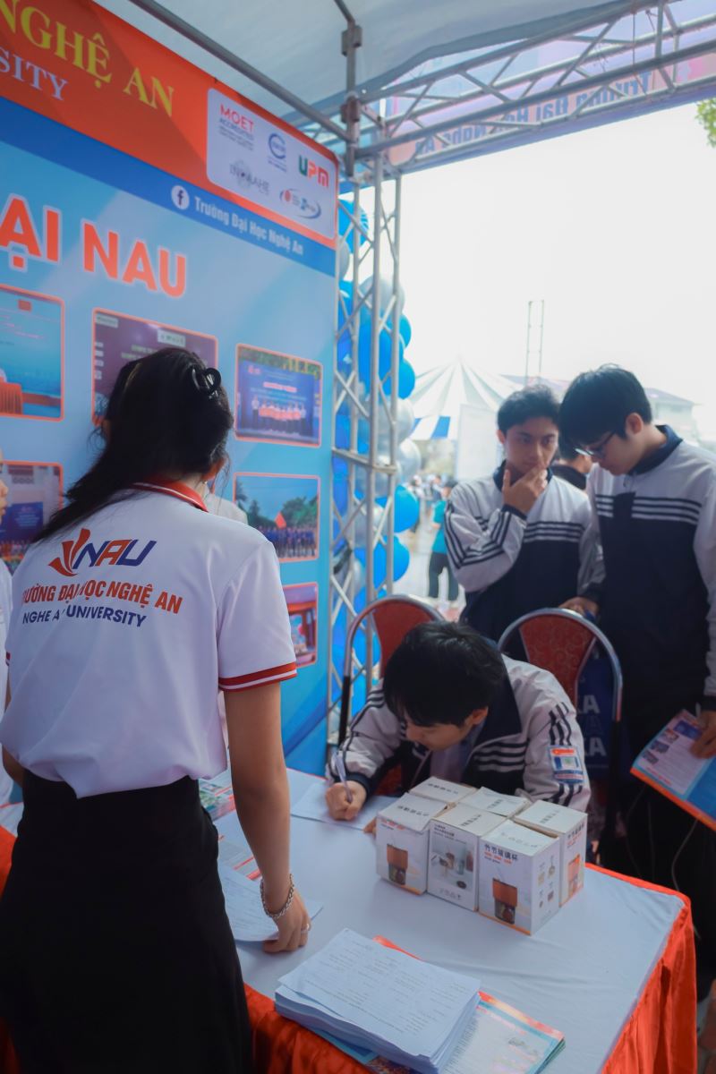 Đội ngũ tư vấn của Nhà trường đã trực tiếp trao đổi, giải đáp tận tình các câu hỏi của học sinh và phụ huynh, giúp các em hiểu rõ hơn về lộ trình học tập, định hướng nghề nghiệp và những lợi thế khi lựa chọn học tập tại Trường Đại học Nghệ An.