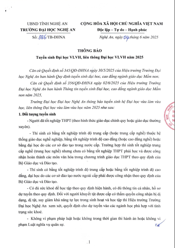 TRƯỜNG ĐẠI HỌC NGHỆ AN BỔ SUNG CHỈ TIÊU TUYỂN SINH VÀ THÔNG BÁO ĐIỂM XÉT TUYỂN ĐẠI HỌC CHÍNH QUY - ĐỢT 4 NĂM 2025