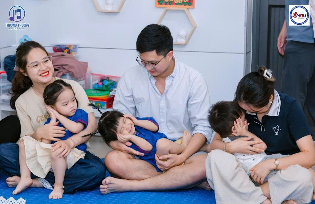 Điểm nhấn đặc biệt của buổi tổng kết chính là sự tham gia trực tiếp của các bậc phụ huynh. Không còn là những “khán giả” phía dưới, bố mẹ đã cùng các con hòa mình vào từng hoạt động: cùng nhún nhảy theo nhịp nhạc, cùng chơi trò chơi âm thanh, cùng thể hiện cảm xúc qua từng giai điệu. Những cái nắm tay, những ánh mắt trao nhau và cả những nụ cười rạng rỡ đã tạo nên một bức tranh đầy yêu thương và gắn kết.