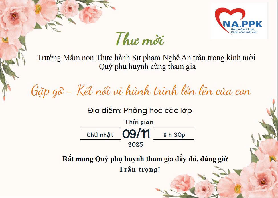Nhằm tăng cường mối quan hệ gắn bó, phối hợp chặt chẽ giữa gia đình và nhà trường trong việc chăm sóc, nuôi dưỡng và giáo dục trẻ, Trường Mầm non Thực hành Sư phạm Nghệ An - Trường Đại học Nghệ An trân trọng tổ chức chương trình: “Gặp gỡ – Kết nối vì hành trình lớn lên của con”