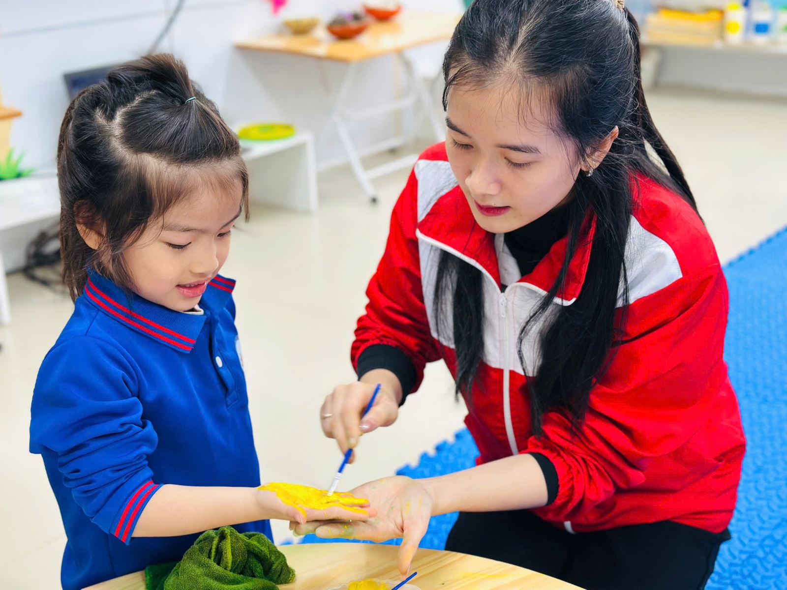 Không dừng lại ở việc lắng nghe, các bé còn được trực tiếp tham gia các hoạt động trải nghiệm, thảo luận nhóm, quan sát hình ảnh về cuộc sống của trẻ em vùng cao; từ đó bày tỏ suy nghĩ, cảm xúc và mong muốn được sẻ chia, giúp đỡ những bạn nhỏ kém may mắn hơn mình. Những bức tranh tập thể mang thông điệp hy vọng – yêu thương – kết nối được các con cùng cô giáo hoàn thiện chính là minh chứng sinh động cho việc giáo dục lòng nhân ái bằng hành động cụ thể.