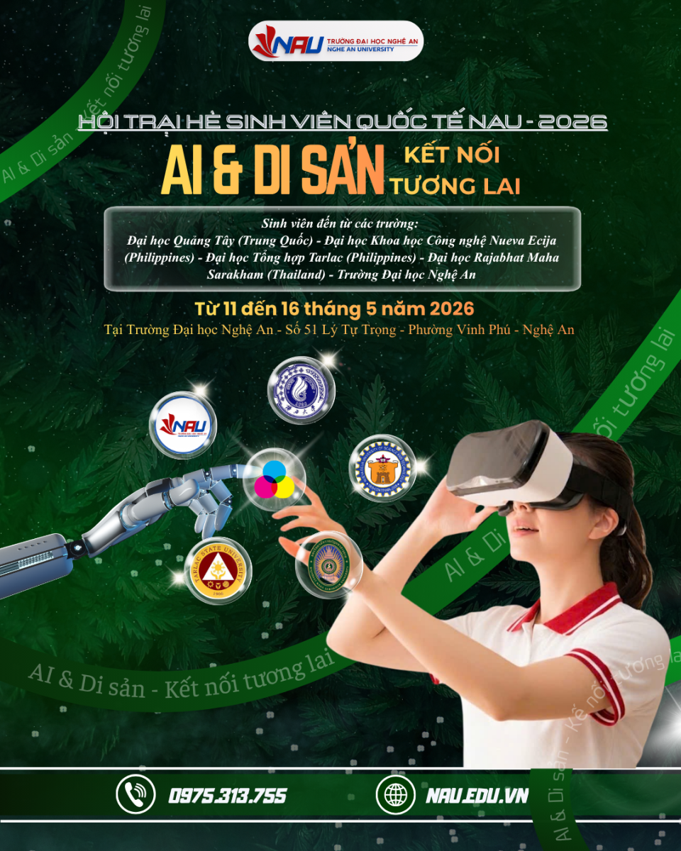 Trong không khí rộn ràng của mùa hè hội nhập, Trường Đại học Nghệ An đang nhanh chóng hoàn thiện những khâu chuẩn bị cuối cùng để chào đón Chương trình Trại hè sinh viên quốc tế – NAU International Summer Camp 2026 với chủ đề "AI & Di sản – Kết nối tương lai". Sự kiện không chỉ là một hoạt động học thuật mà còn là ngày hội lớn của tình hữu nghị, nơi những trái tim trẻ từ nhiều quốc gia cùng hội tụ, sẻ chia và kết nối.