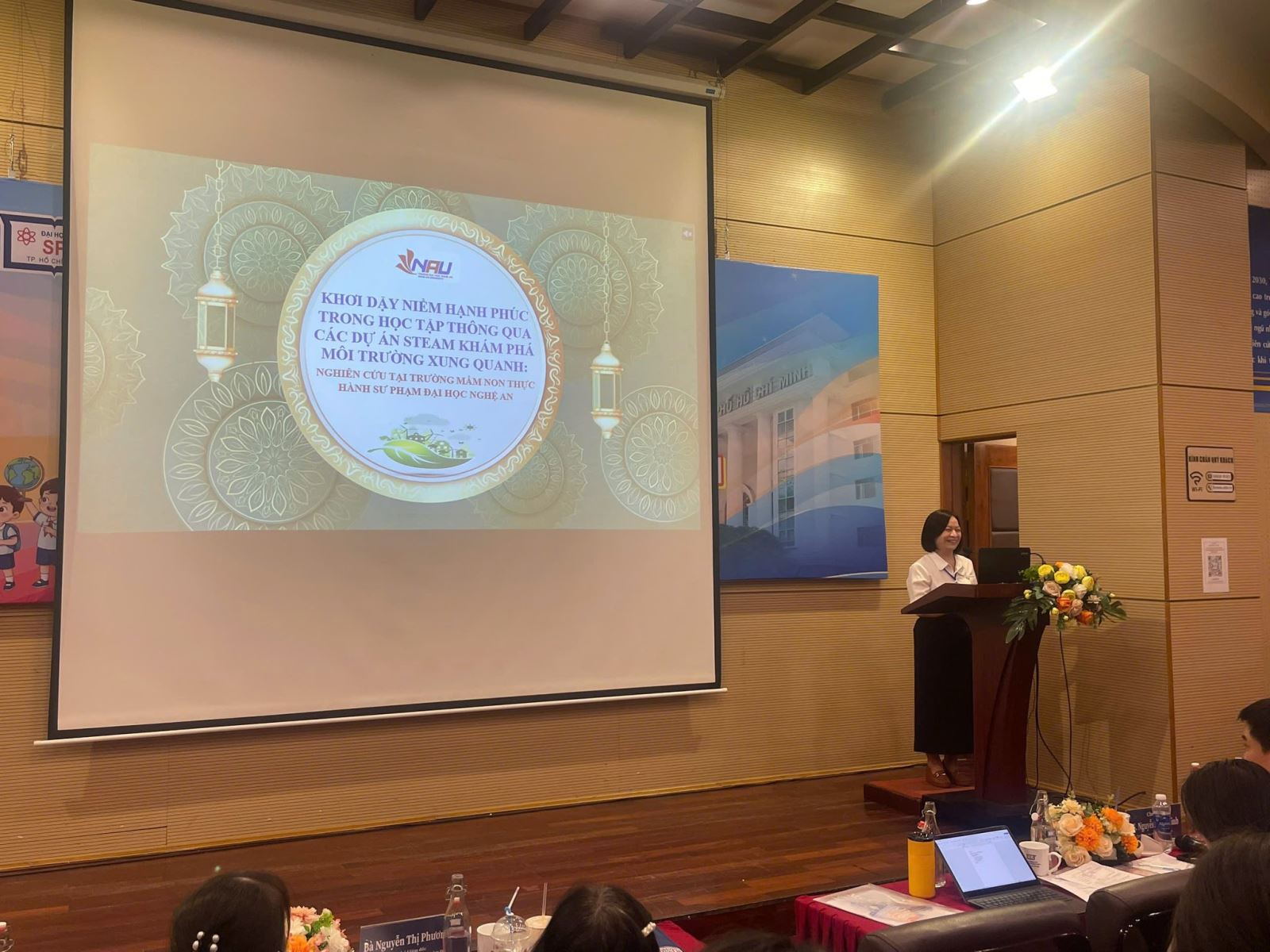 Đóng góp nổi bật tại hội thảo, Thạc sĩ Nguyễn Thị Sương Lan – đại diện đoàn công tác Trường Đại học Nghệ An – đã trình bày báo cáo khoa học với chủ đề: “Khơi dậy niềm hạnh phúc trong học tập thông qua các dự án STEAM khám phá môi trường xung quanh – Nghiên cứu tại Trường Mầm non Thực hành Sư phạm Đại học Nghệ An”.