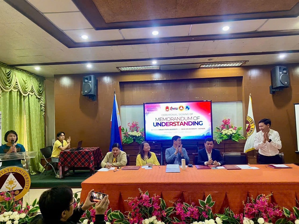 Trong chiến lược phát triển trở thành cơ sở giáo dục đại học định hướng ứng dụng, hội nhập sâu rộng và từng bước khẳng định vị thế trong khu vực, ngày 27/11/2025, Trường Đại học Nghệ An (NAU) đã chính thức ký kết Biên bản Ghi nhớ hợp tác (Memorandum of Understanding – MOU) với Trường Đại học Tarlac State University (TSU), Philippines. Lễ ký kết được tổ chức tại Hội trường AVR của TSU, diễn ra trong không khí trang trọng, cởi mở và thắm đượm tinh thần hữu nghị, hợp tác, đánh dấu một bước tiến quan trọng trong quan hệ đối tác quốc tế của Nhà trường. Buổi lễ là minh chứng rõ nét cho nỗ lực không ngừng của Trường Đại học Nghệ An trong việc mở rộng mạng lưới hợp tác toàn cầu, chủ động kết nối với các cơ sở giáo dục đại học uy tín trong khu vực Đông Nam Á và trên thế giới, qua đó nâng cao chất lượng đào tạo, nghiên cứu khoa học và năng lực hội nhập cho đội ngũ giảng viên, sinh viên.