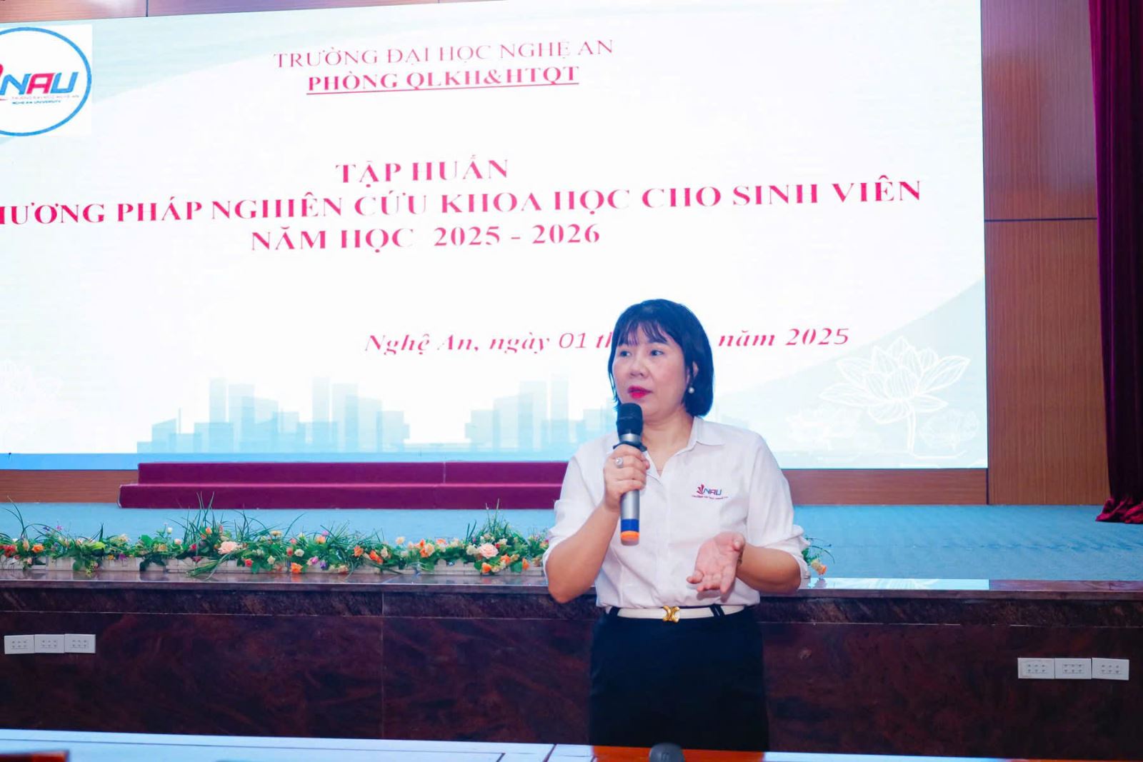 Nghiên cứu khoa học là hoạt động quan trọng giúp sinh viên rèn luyện tư duy sáng tạo, kỹ năng giải quyết vấn đề và tạo nền tảng cho học tập, nghề nghiệp sau khi ra trường, nhận thấy tầm quan trọng đó, sáng ngày 01 tháng 11 năm 2025, tại Hội trường A1 Trường Đại học Nghệ An, Phòng Quản lý khoa học và Hợp tác quốc tế đã tổ chức chương trình tập huấn “Phương pháp nghiên cứu khoa học cho sinh viên” năm học 2025 – 2026.
