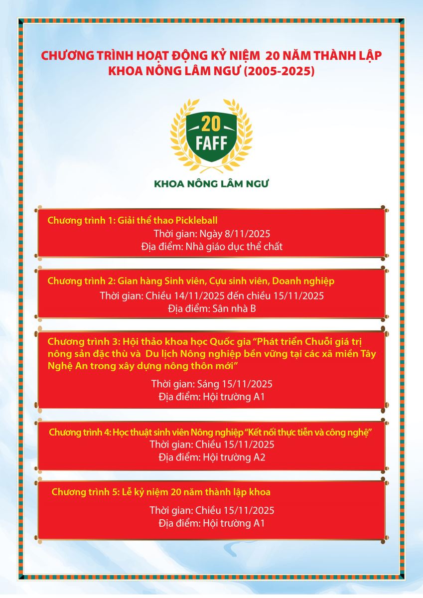 Chương trình hoạt động kỷ niệm 20 năm thành lập khoa Nông Lâm Ngư (2005 - 2025) 28/10/2025 11:41 75 lượt xem