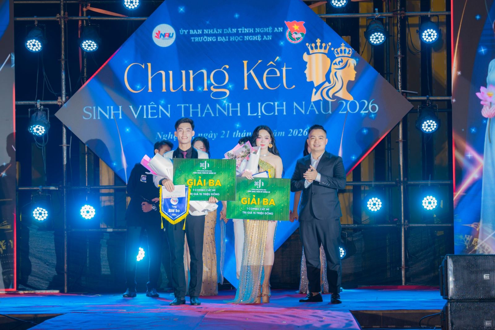 TS. Trương Quang Ngân - UVBTV Đảng ủy, Phó Hiệu trưởng Nhà trường; TS. Đàm Thị Ngọc Ngà – UVBTV Đảng ủy, Phó Hiệu trưởng Nhà trường và Bà Trần Thị Nhung – Giám đốc Điều hành Hệ thống PTTM Hường Xô trao danh hiệu Hoa khôi và Nam vương “Sinh viên Thanh lịch NAU 2026”