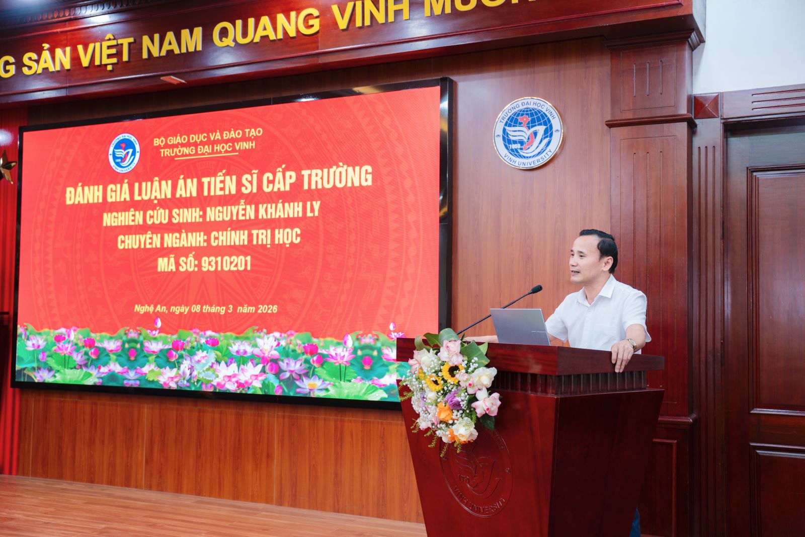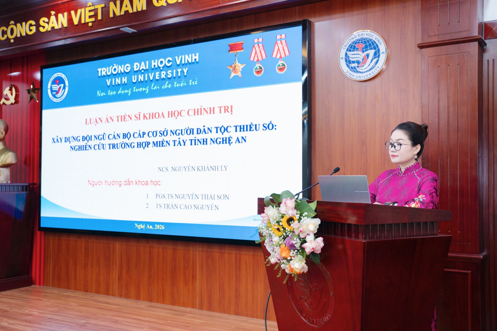 Sáng ngày 08/3/2026, tại Trường Đại học Vinh, NCS Nguyễn Khánh Ly là giảng viên khoa Khoa học cơ bản - Trường Đại học Nghệ An đã bảo vệ thành công Luận án tiến sĩ, chuyên ngành Chính trị học, Mã số: 9 31 01 02 với đề tài: “Xây dựng đội ngũ cán bộ cấp cơ sở người dân tộc thiểu số: Nghiên cứu trường hợp miền Tây tỉnh Nghệ An”, đề tài dưới sự hướng dẫn của PGS.TS Nguyễn Thái Sơn và TS. Trần Cao Nguyên.