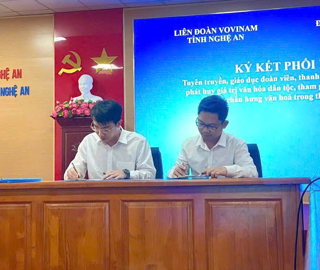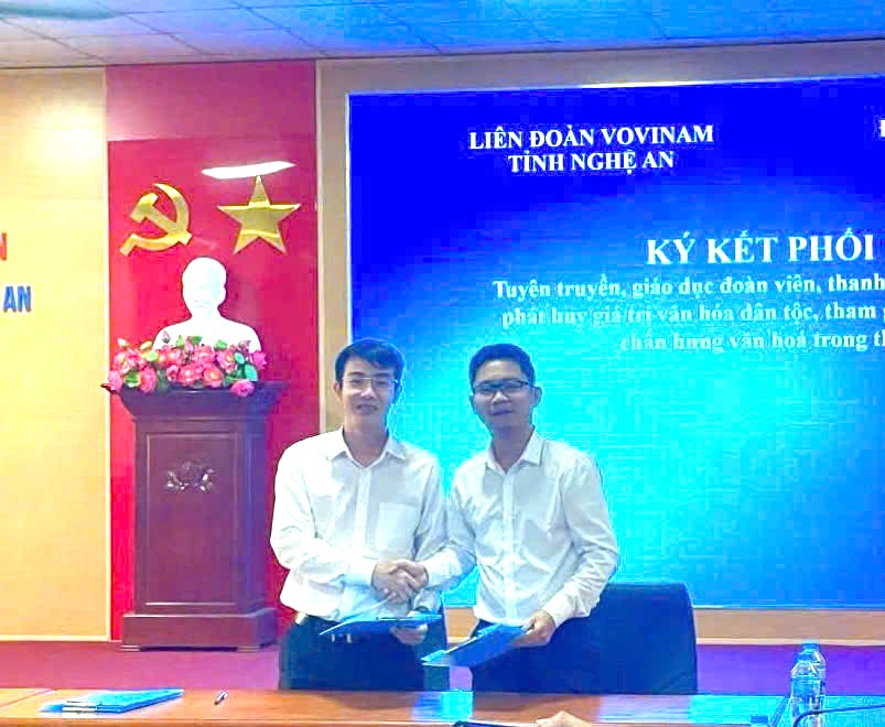 Sáng ngày 17/5, tại Trường Đại học Nghệ An đã diễn ra lễ ký kết thỏa thuận hợp tác giữa Liên đoàn Vovinam tỉnh Nghệ An và Đoàn Trường Đại học Nghệ An trong công tác tuyên truyền, giáo dục thế hệ trẻ gìn giữ, phát huy giá trị văn hoá dân tộc và tham gia chấn hưng văn hoá trong thời kỳ mới.