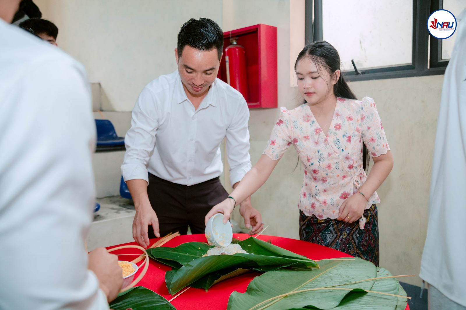 Dưới sự hướng dẫn tận tình của thầy cô và sự sẻ chia của sinh viên Việt Nam, các lưu học sinh Lào lần đầu được trực tiếp trải nghiệm từng công đoạn gói bánh chưng: từ xếp lá, cho nhân, buộc lạt đến hoàn thiện chiếc bánh vuông vắn, trang trọng. Xen lẫn trong quá trình ấy là những câu chuyện về phong tục ngày Tết, về ý nghĩa của bánh chưng trong đời sống tinh thần người Việt, tượng trưng cho đất trời, lòng biết ơn tổ tiên và ước vọng về một năm mới đủ đầy, no ấm.