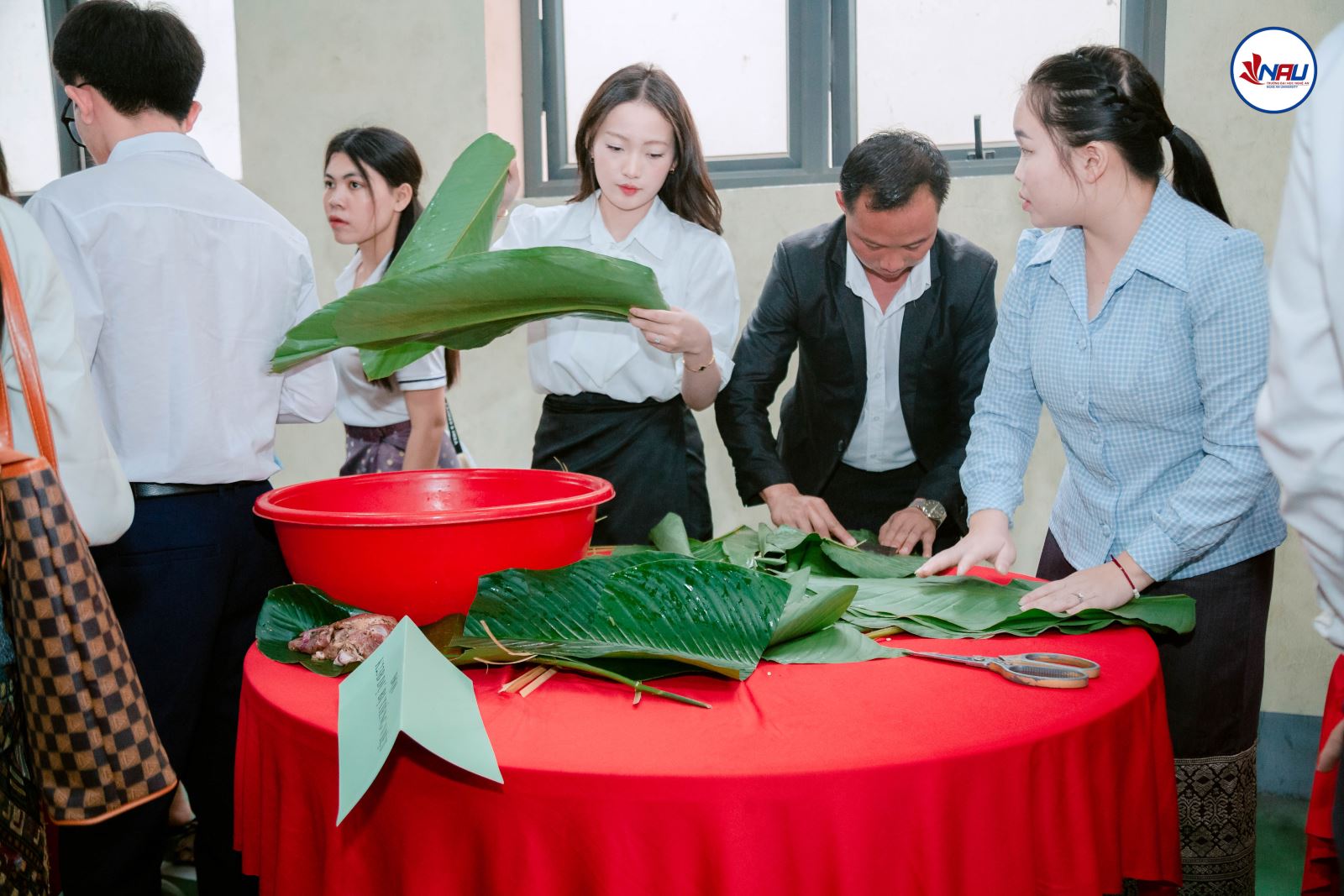 Hội thi gói bánh chưng là hoạt động điểm nhấn giàu ý nghĩa của chương trình giao lưu văn hóa Việt – Lào, thu hút sự tham gia hào hứng của thầy cô giáo, sinh viên Việt Nam và các lưu học sinh Lào. Trong không gian rộn ràng sắc Xuân, mọi người cùng nhau chuẩn bị lá dong xanh, gạo nếp trắng, đậu xanh vàng, thịt lợn tươi – những nguyên liệu mộc mạc nhưng gắn bó mật thiết với Tết cổ truyền của dân tộc Việt Nam.