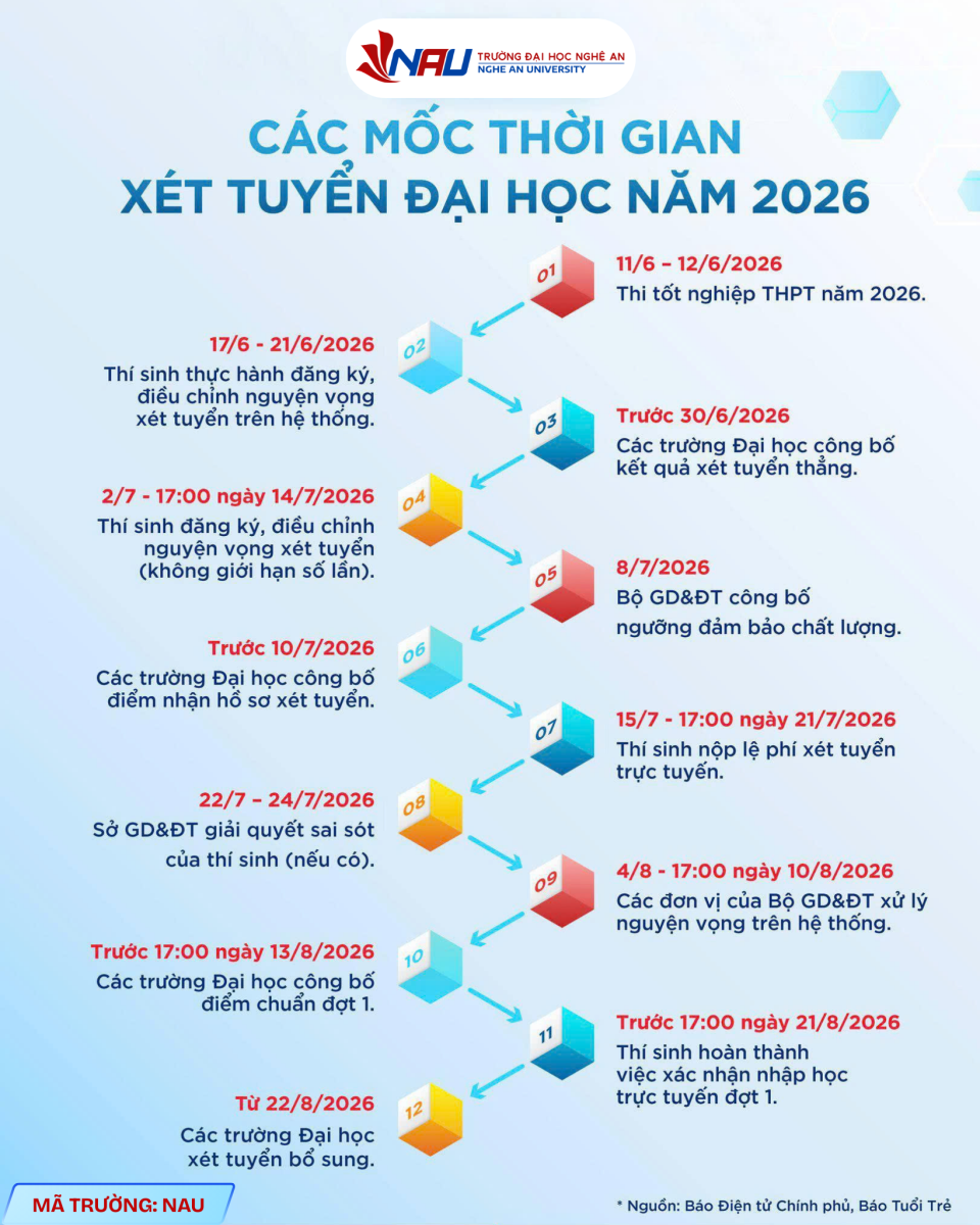 Để hỗ trợ thí sinh nắm bắt đầy đủ thông tin, Trường Đại học Nghệ An (NAU) đã tổng hợp các mốc thời gian quan trọng của kỳ tuyển sinh đại học năm 2026. Việc theo dõi sát các mốc thời gian này sẽ giúp thí sinh chủ động hơn trong quá trình đăng ký xét tuyển, điều chỉnh nguyện vọng và hoàn tất thủ tục nhập học.