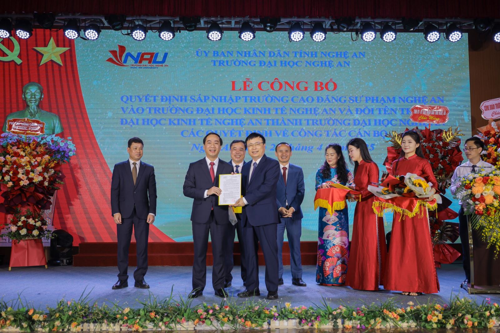 Trong không khí trang trọng và đầy ý nghĩa của buổi Lễ công bố Quyết định của Thủ tướng Chính phủ về việc sáp nhập Trường Cao đẳng Sư phạm Nghệ An vào Trường Đại học Kinh tế Nghệ An, và chính thức đổi tên thành Trường Đại học Nghệ An.