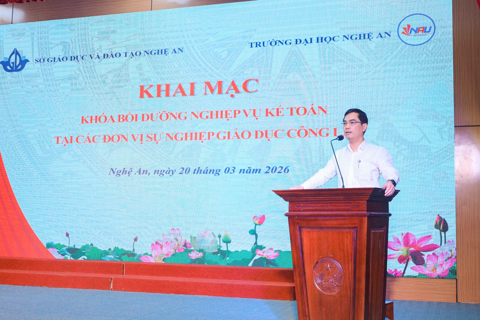 Sáng ngày 20/3/2026, Trường Đại học Nghệ An phối hợp với Sở Giáo dục và Đào tạo Nghệ An long trọng tổ chức Khai mạc lớp bồi dưỡng “Nâng cao năng lực quản trị tài chính, nghiệp vụ kế toán, thủ quỹ” dành cho cán bộ quản lý, giáo viên, nhân viên các trường mầm non, tiểu học, THCS và THPT trên địa bàn tỉnh.