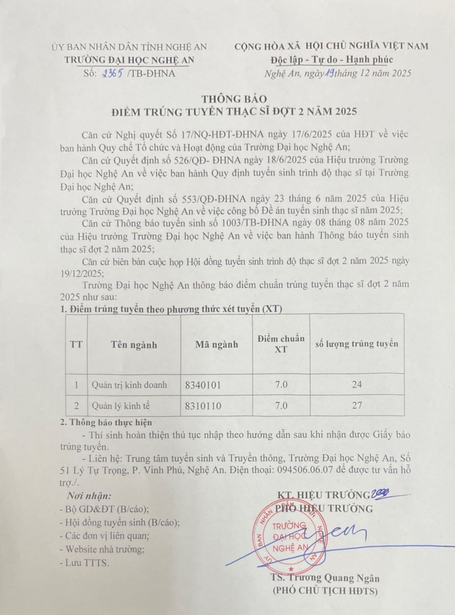 Thông báo điểm trúng tuyển Thạc sĩ đợt 2 năm 2025 19/12/2025 10:16 6 lượt xem Trường Đại học Nghệ An thông báo điểm trúng tuyển Thạc sĩ đợt 2 năm 2025