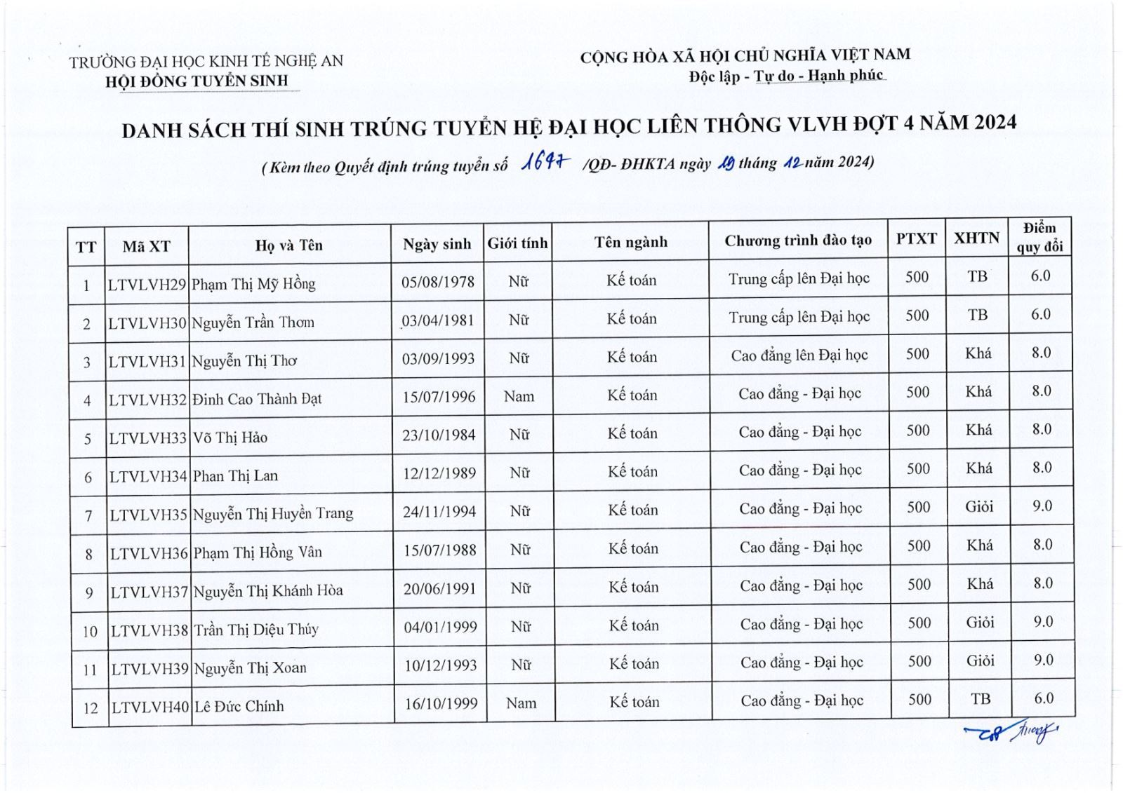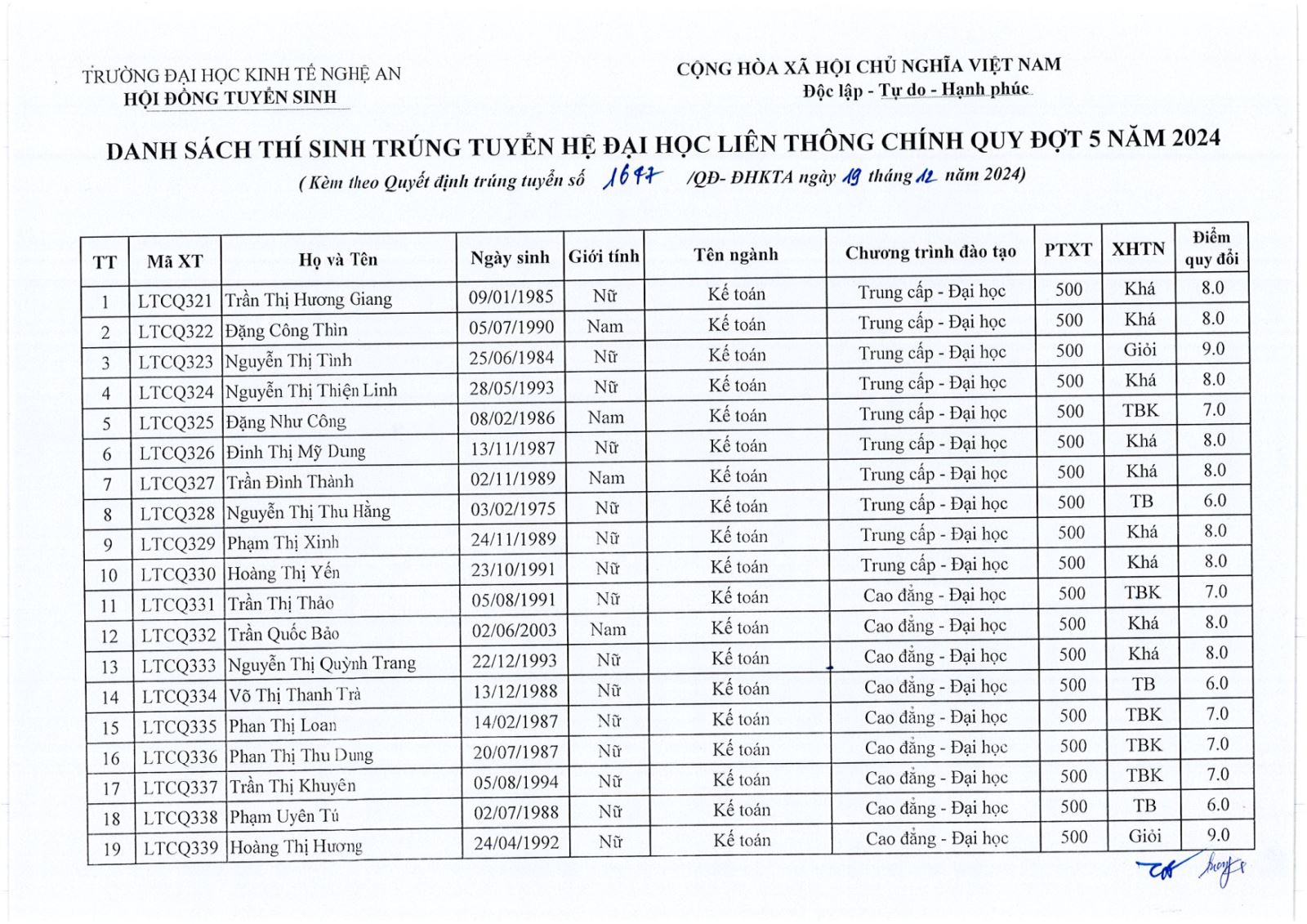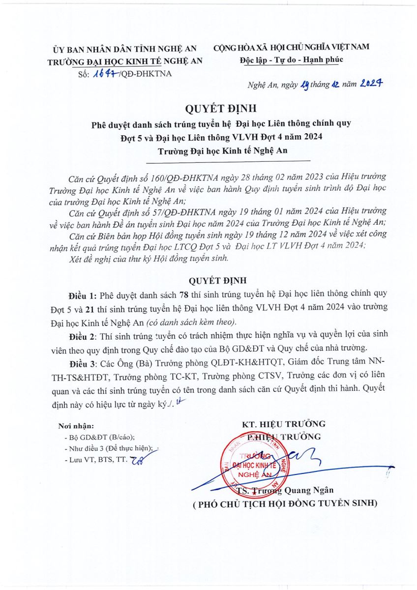 Quyết định phê duyệt danh sách trúng tuyển hệ Đại học liên thông chính quy đợt 5 và Đại học liên thông VLVH đợt 4 năm 2024 19/12/2024 04:40 2150 lượt xem