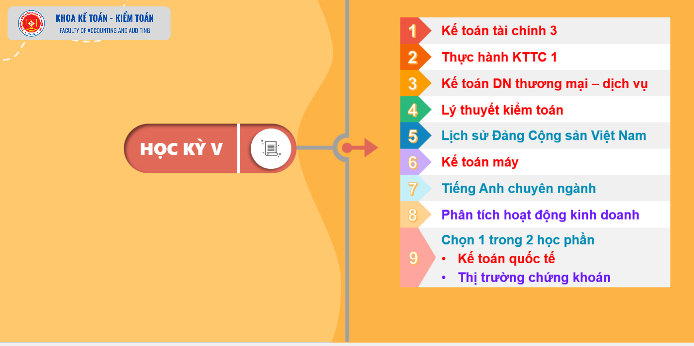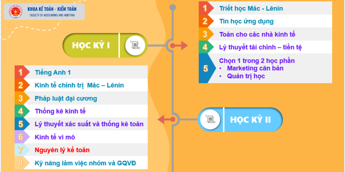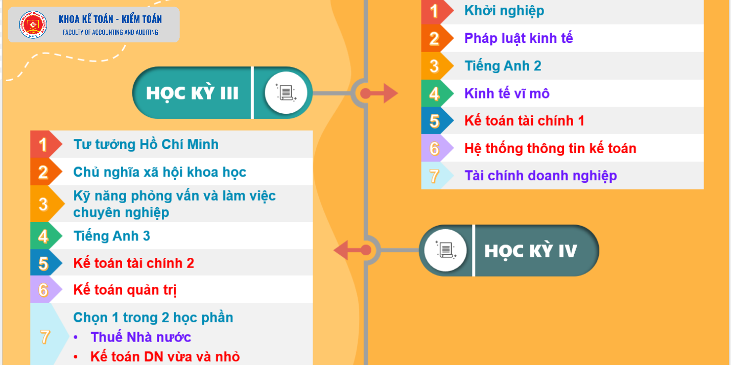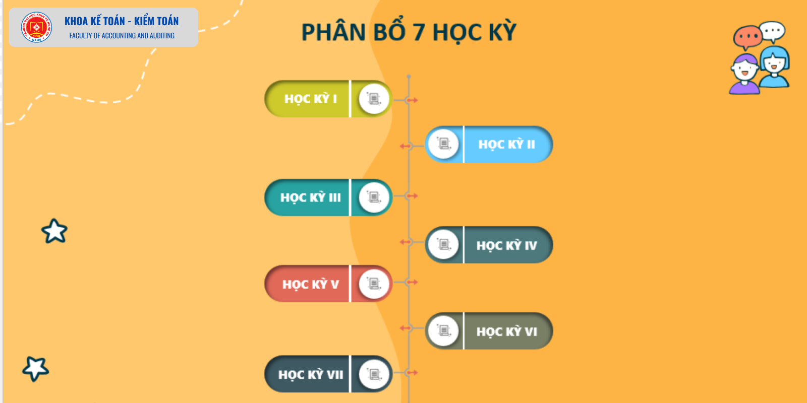Chương trình đào tạo ngành Kế toán - lộ trình của bạn 30/10/2024 09:07 2598 lượt xem Ngành Kế toán học những gì? học bao lâu? Toàn bộ Chương trình đào tạo ngành Kế toán bao gồm 44 học phần tương ứng với 129 tín chỉ, thời gian học học 3,5 năm được chia thành 7 kỳ:
