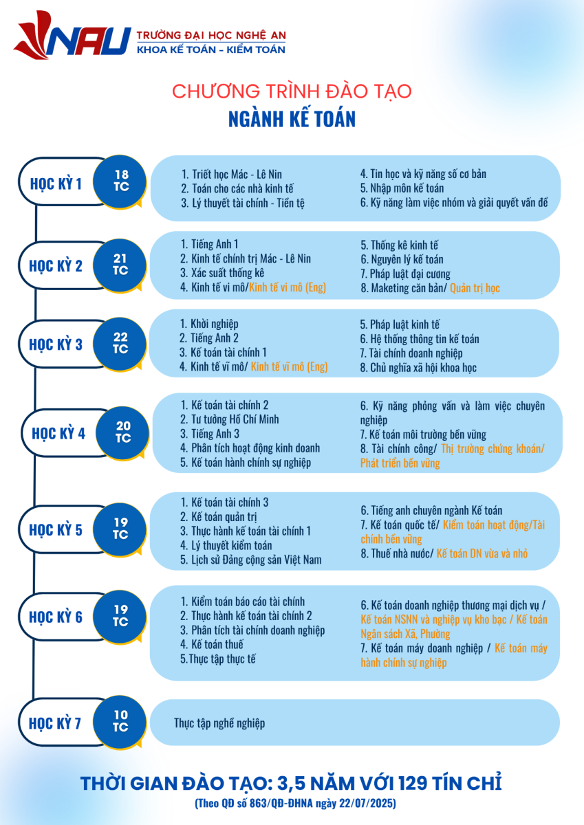 Ngành Kế toán tại Trường Đại học Nghệ An được xây dựng với lộ trình đào tạo tiên tiến, khoa học, hiện đại, thích ứng nền kinh tế số, rút gọn trong 3,5 năm (tương đương 7 học kỳ với 129 tín chỉ), giúp sinh viên ra trường sớm hơn nhưng vẫn đảm bảo đầy đủ kiến thức chuyên sâu và kỹ năng nghề nghiệp thực tiễn.