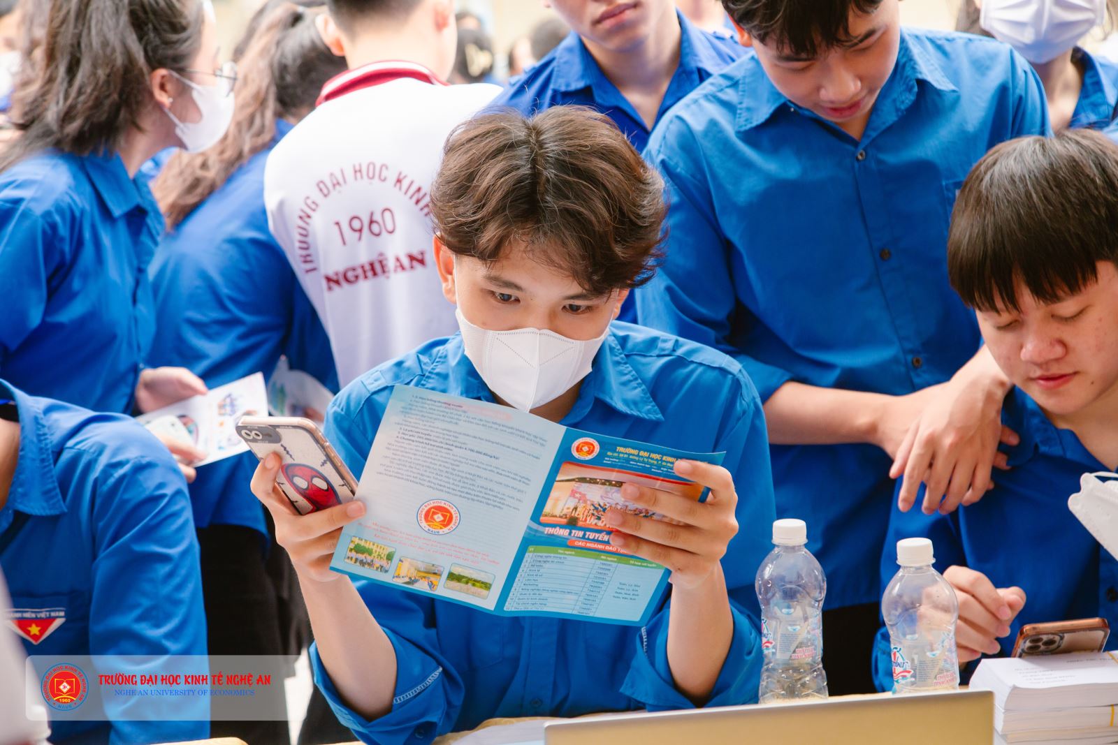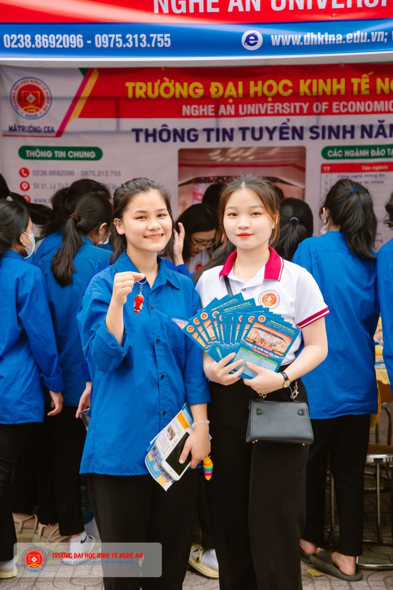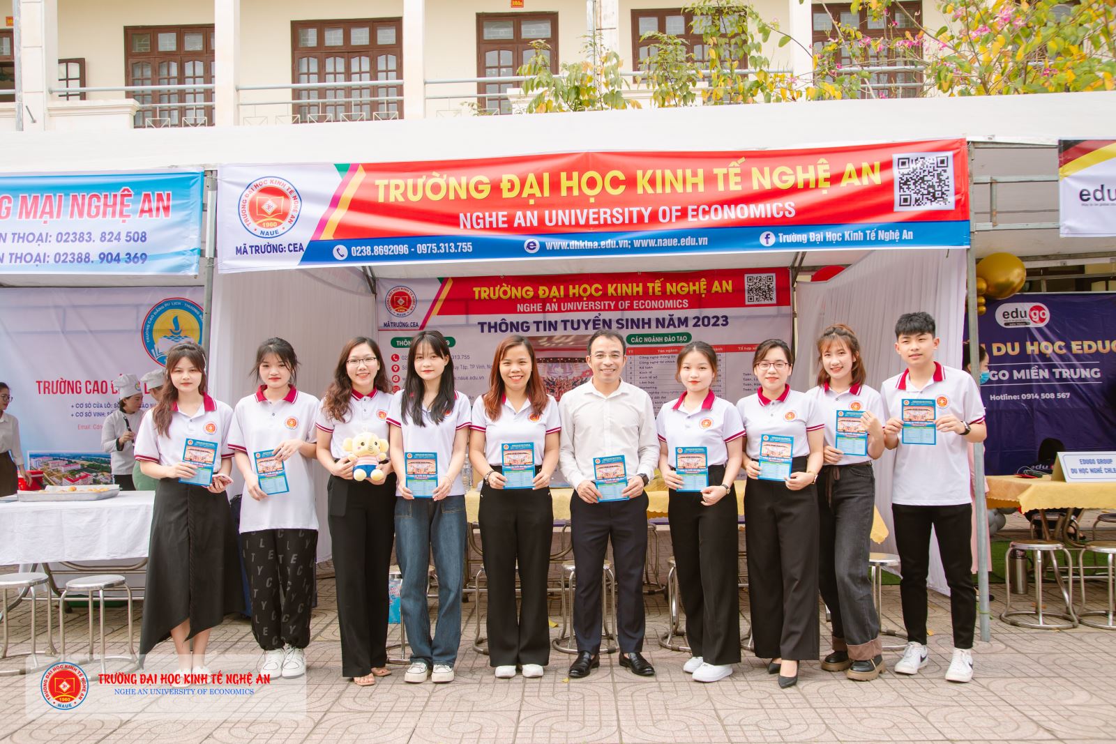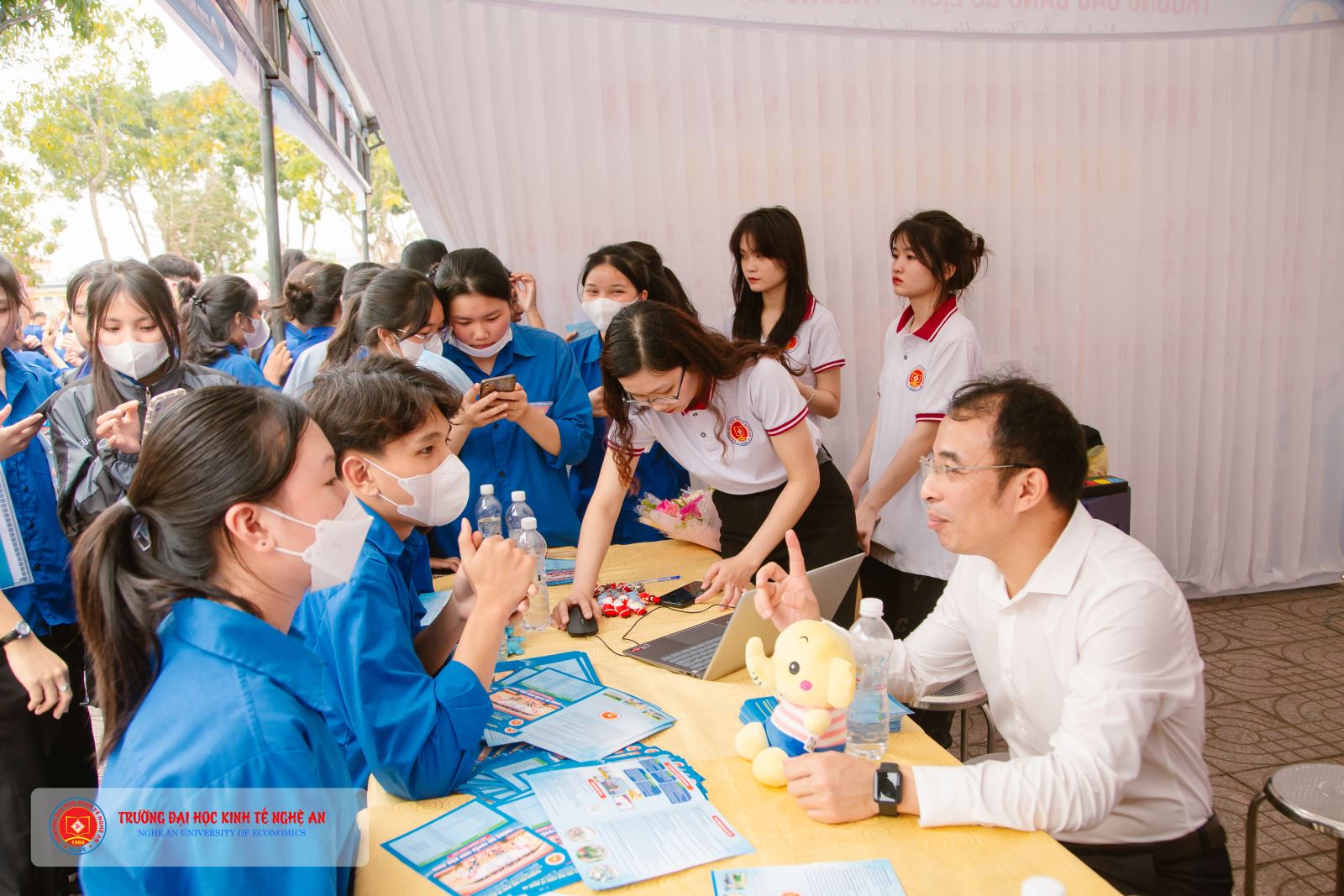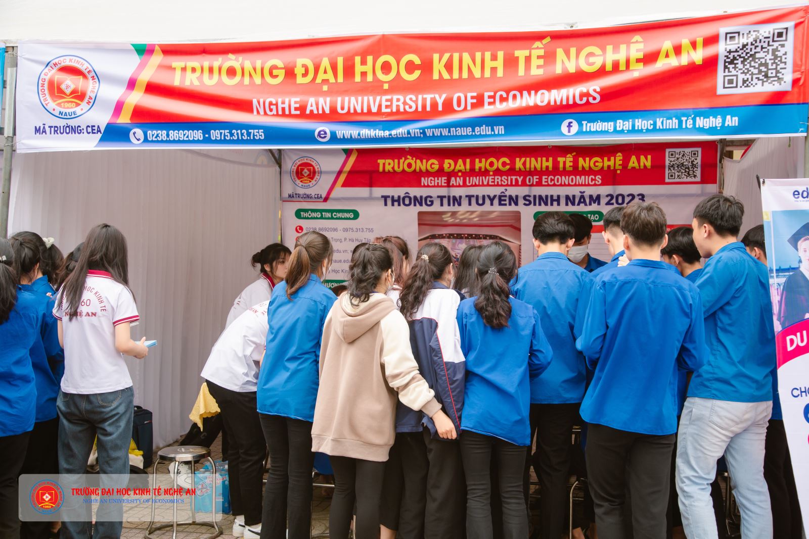 Gian hàng của Trường Đại học Kinh tế Nghệ An được trang trí bắt mắt với các nội dung quảng bá, tư vấn sẵn sàng phục vụ nhu cầu của học sinh. Tại đây, đại diện Trường Đại học Kinh tế Nghệ An đã chia sẽ về đối tượng, chỉ tiêu, phương thức tuyển sinh năm 2023, thời gian nhận hồ sơ và các chính sách ưu tiên của Nhà trường trong quá trình học tập tại trường đó là được miễn giảm học phí lên đến 100%, được nhận học bổng. Đặc biệt, Nhà trường còn có chương trình hỗ trợ sinh viên như cam kết giới thiệu việc làm trong nước cho sinh viên sau khi tốt nghiệp. Gian hàng ĐHKTNA đã tổ chức các chương trình chụp hình, trò chơi với nhiều phần quà hấp dẫn đã thu hút được đông đảo các bạn học sinh tham gia.