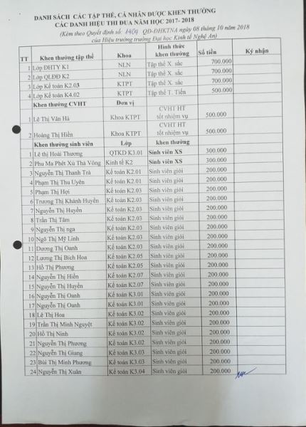 Quyết định và danh sách các tập thể và cá nhân được khen thưởng về năm học 2017 - 2018 19/04/2019 03:39 6616 lượt xem /Quyết định khen thưởng các tập thể và cá nhân có thành tích xuất sắc năm học 2017 - 2018(1).docx /Danh sách các tập thể và cá nhân sinh viên được khen thưởng1.jpg /Danh sách các tập thể và cá nhân sinh viên được khen thưởng 2.jpg
