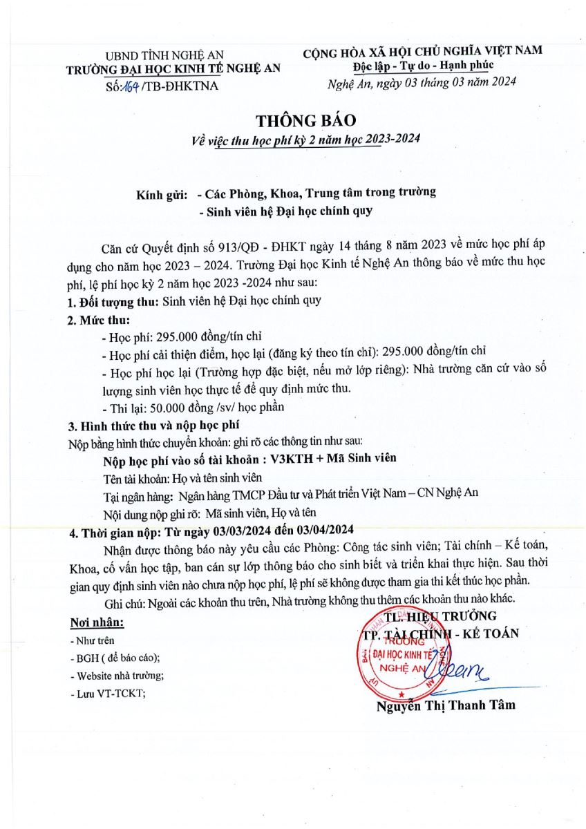Thông báo về việc nạp học phí học kỳ 2, năm học 2023-2024 04/03/2024 05:40 1759 lượt xem Căn cứ Quyết định số 913/QĐ - ĐHKT ngày 14 tháng 8 năm 2023 về mức học phí áp dụng cho năm học 2023 – 2024. Trường Đại học Kinh tế Nghệ An thông báo về mức thu học phí, lệ phí học kỳ 2 năm học 2023 -2024 như sau: