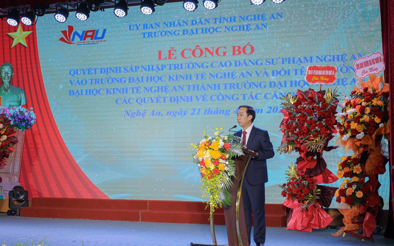Phát biểu tại lễ công bố, đồng chí Phó Chủ tịch UBND tỉnh Bùi Đình Long chúc mừng tập thể Trường Đại học Nghệ An bước vào một giai đoạn lịch sử mới. Đồng thời đã khẳng định việc thành lập trường là phù hợp với xu thế phát triển mới hiện nay, trong giai đoạn chuyển mình của dân tộc. Quyết định sáp nhập Trường Cao đẳng Sư phạm Nghệ An vào Trường Đại học Kinh tế Nghệ An không chỉ là sự hợp nhất về mặt tổ chức, mà còn là bước chuyển mình quan trọng để hình thành một ngôi trường đại học đa ngành, đa lĩnh vực, đa bậc học, có khả năng đáp ứng tốt hơn các yêu cầu phát triển kinh tế - xã hội của tỉnh và khu vực. Trường Đại học Nghệ An được kỳ vọng sẽ trở thành điểm sáng trong hệ thống giáo dục đại học Việt Nam, tiên phong trong việc đổi mới sáng tạo, ứng dụng công nghệ vào giảng dạy và nghiên cứu khoa học.” Đồng chí Chủ tịch UBND tỉnh cũng nhấn mạnh trong bài phát biểu giao nhiệm vụ: “Nhà trường cần đẩy mạnh hợp tác quốc tế, ứng dụng công nghệ vào giảng dạy, nghiên cứu khoa học và liên kết với doanh nghiệp để sinh viên không chỉ được học lý thuyết mà còn phát triển kỹ năng thực tiễn, đáp ứng tiêu chuẩn toàn cầu.”