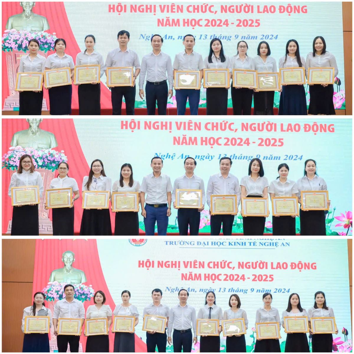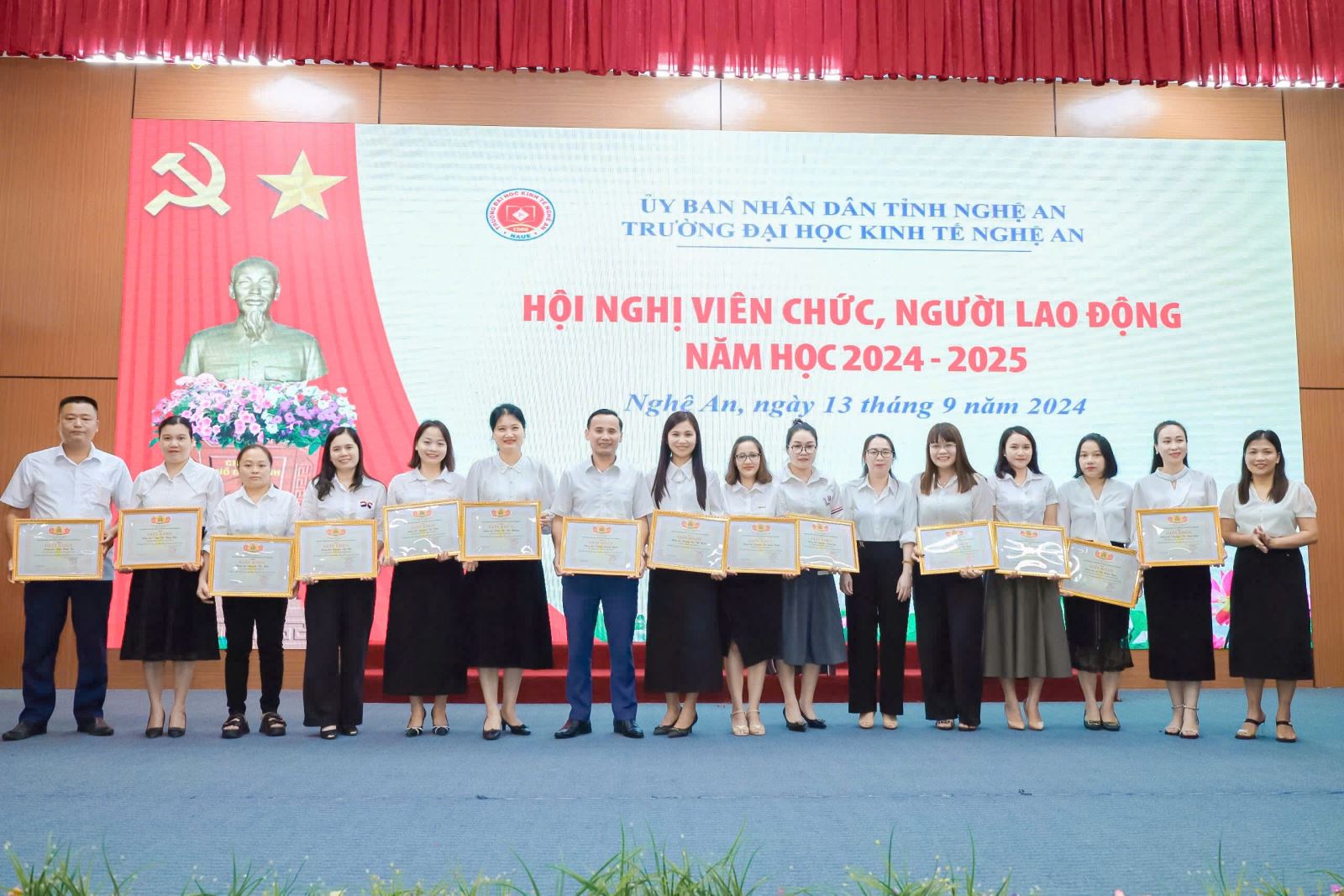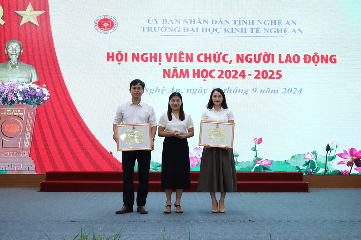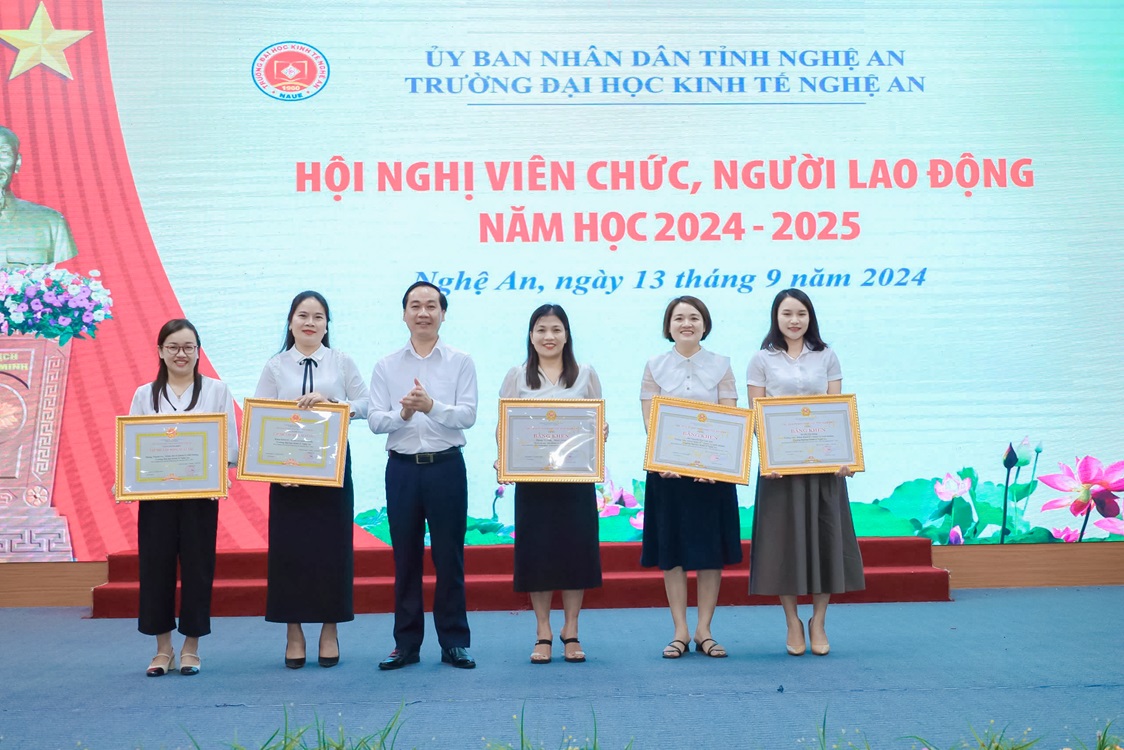 TS. Nguyễn Ngọc Hiếu - Hiệu trưởng Trường Đại học Kinh tế Nghệ An, thừa uỷ quyền của Chủ tịch UBND tỉnh Nghệ An trao Bằng khen của Chủ tịch UBND tỉnh cho cá tập thể và cá nhân
