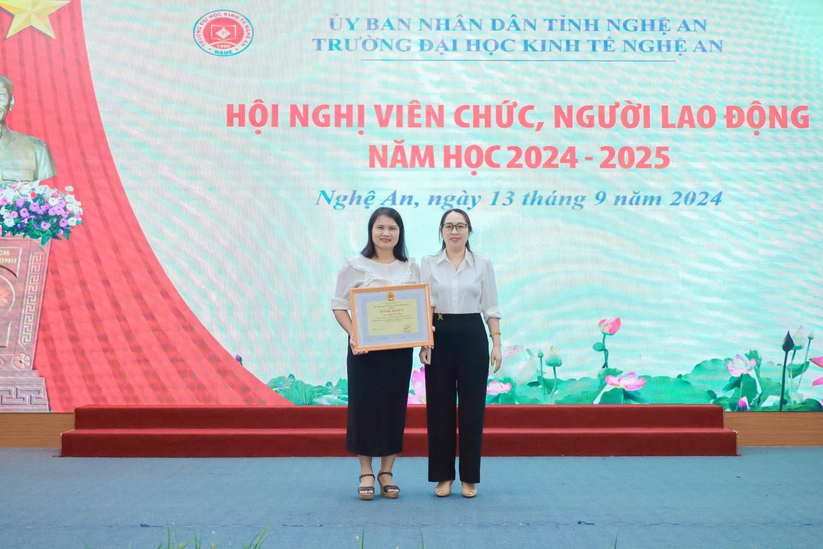 TS. Võ Thị Dung - Trưởng Ban nữ công Trường Đại học Kinh tế Nghệ An, thừa uỷ quyền của Chủ tịch Liên đoàn Lao động tỉnh Nghệ An, trao Bằng khen của Liên đoàn lao động tỉnh Nghệ An cho cá nhân có thành tích xuất sắc trong phong trào “giỏi việc nước - đảm việc nhà” năm học 2023-2024 cho đồng chí Nguỵ Vân Thuỳ