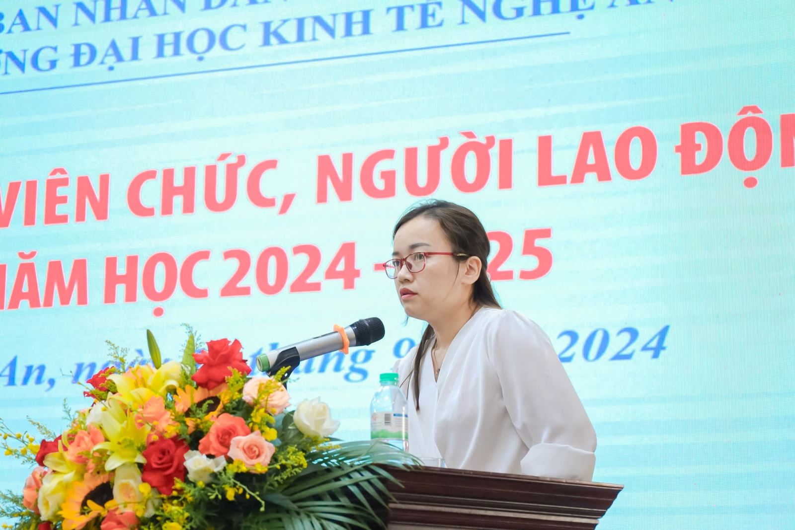 Tại hội nghị, thay mặt BCH Công đoàn, TS. Đặng Thị Thảo - Chủ tịch Công đoàn trường trình bày Báo cáo kết quả hoạt động của Công đoàn trường năm học 2023-2024 và triển khai nhiệm vụ năm học 2024-2025.