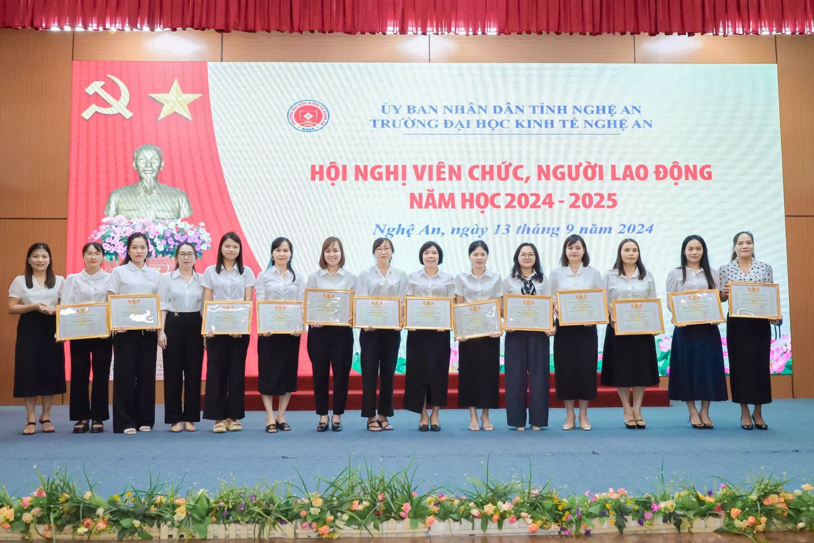 TS. Đặng Thị Thảo - Chủ tịch Công đoàn Trường Đại học Kinh tế Nghệ An, thừa uỷ quyền của Chủ tịch Liên đoàn Lao động tỉnh Nghệ An, trao Bằng khen vì sự nghiệp CĐ của Liên đoàn lao động tỉnh Nghệ An cho các công đoàn viên NAUE