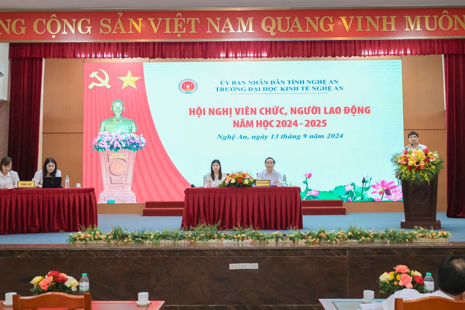 Thực hiện kế hoạch công tác năm học 2024-2025, ngày 13/9/2024, Trường Đại học Kinh tế Nghệ An long trọng tổ chức Hội nghị Viên chức, Người lao động năm học 2024-2025. Hội nghị có ý nghĩa quan trọng, nhằm đánh giá và tổng kết những kết quả đã đạt được trong năm học 2023 - 2024 và phương hướng nhiệm vụ năm 2024 - 2025.