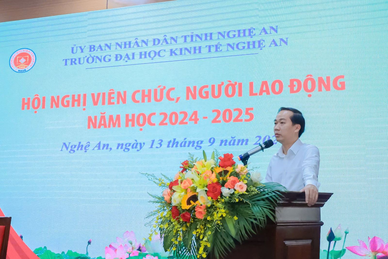 Tại Hội nghị, TS. Nguyễn Ngọc Hiếu cũng đã trình bày báo cáo Tổng kết công tác năm học 2023 - 2024 và phương hướng nhiệm vụ năm học 2024 - 2025. Theo đó, năm học 2023 - 2024 Trường Đại học Kinh tế Nghệ An đã hoàn thành tốt các nhiệm vụ trong năm học, trong đó có công tác tuyển sinh - đào tạo, hoạt động khoa học công nghệ, hợp tác quốc tế, khảo thí và đảm bảo chất lượng, quản lý sinh viên, hoạt động đoàn thể... Nhằm phát huy những kết quả đã đạt được và khắc phục những hạn chế trong năm học 2023 - 2024, Nhà trường đã đề ra phương hướng, mục tiêu cụ thể và các nhiệm vụ chủ yếu về công tác chính trị - tư tưởng, quản trị trường đại học, Hội đồng trường; công tác tuyển sinh, đào tạo, nghiên cứu khoa học, hợp tác quốc tế, quản lý chất lượng, công tác tổ chức cán bộ, công tác thanh tra, pháp chế, thi đua khen thưởng, công tác tài chính, công tác quản lý sinh viên và một số công tác khác trong năm học 2024 - 2025.