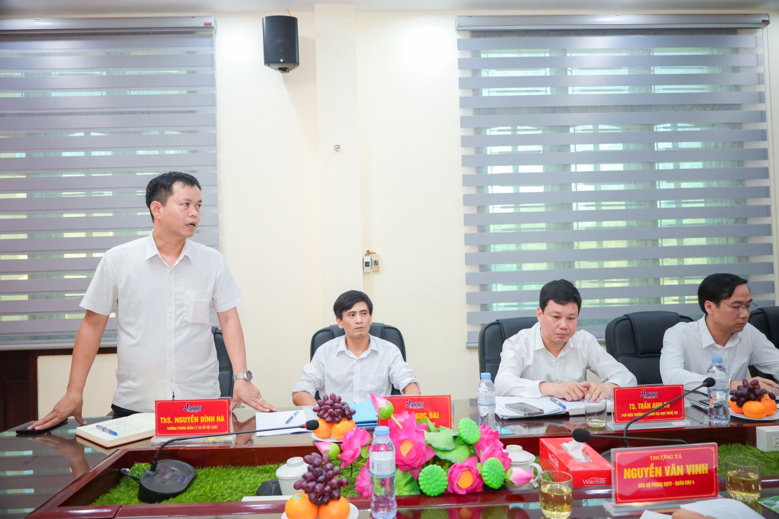 Đồng chí Nguyễn Đình Hà - Trưởng phòng Quản lý Cơ sở vật chất báo cáo về công tác chuẩn bị cơ sở vật chất cho dạy và học an ninh quốc phòng