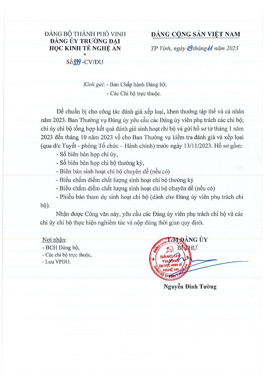 Để chuẩn bị cho công tác đánh giá xếp loại, khen thưởng tập thể và cá nhân năm 2023. Ban Thường vụ Đảng ủy yêu cầu các Đảng ủy viên phụ trách các chỉ bị hi ủy chi bộ tổng hợp kết quả đánh giá sinh hoạt chi bộ và gửi hồ sơ từ tháng 1 năm 023 đến tháng 10 năm 2023 về cho Ban Thường vụ kiểm tra đánh giá và xếp lại qua đ/c Tuyết - phỏng Tổ chức – Hành chính) trước ngày 13/11/2023. Hồ sơ gồm