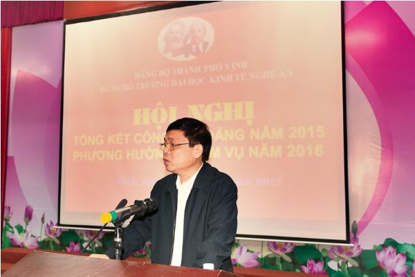 Phát biểu tại hội nghị, đồng chí Nguyễn Trung Châu – Trưởng Ban tuyên giáo thành uỷ Vinh đã ghi nhận và đánh giá cao những kết quả đã đạt được của Đảng bộ Trường Đại học Kinh tế Nghệ An trong năm qua, đồng thời đồng chí cũng đã nhấn mạnh trong thời gian tới Nhà trường cần tiếp tục đẩy mạnh các phong trào thi đua gắn với cuộc vận động học tập và làm theo tấm gương đạo đức Chủ tịch Hồ Chí Minh với chủ đề của năm 2015: “ Học tập và làm theo tấm gương đạo đức Hồ Chí Minh về trung thực, trách nhiệm, gắn bó với nhân dân, đoàn kết xây dựng Đảng trong sạch, vững mạnh”. Bên cạnh đó, Nhà trường cần chú trọng đến các nhiệm vụ trọng tâm như: Tiếp tục tìm kiếm các giải pháp để tăng cường công tác tuyển sinh; nâng cao chất lượng đội ngũ cán bộ, giảng viên đáp ứng yêu cầu của nhà trường và xã hội trong giai đoạn mới; nâng cao chất lượng đào tạo giữ vững thương hiệu của nhà trường; chú trọng công tác nghiên cứu khoa học trong cán bộ, giảng viên và sinh viên; tích cực phối hợp với các doanh nghiệp để tạo địa bàn thực tập và góp phần giải quyết đầu ra cho sinh viên…