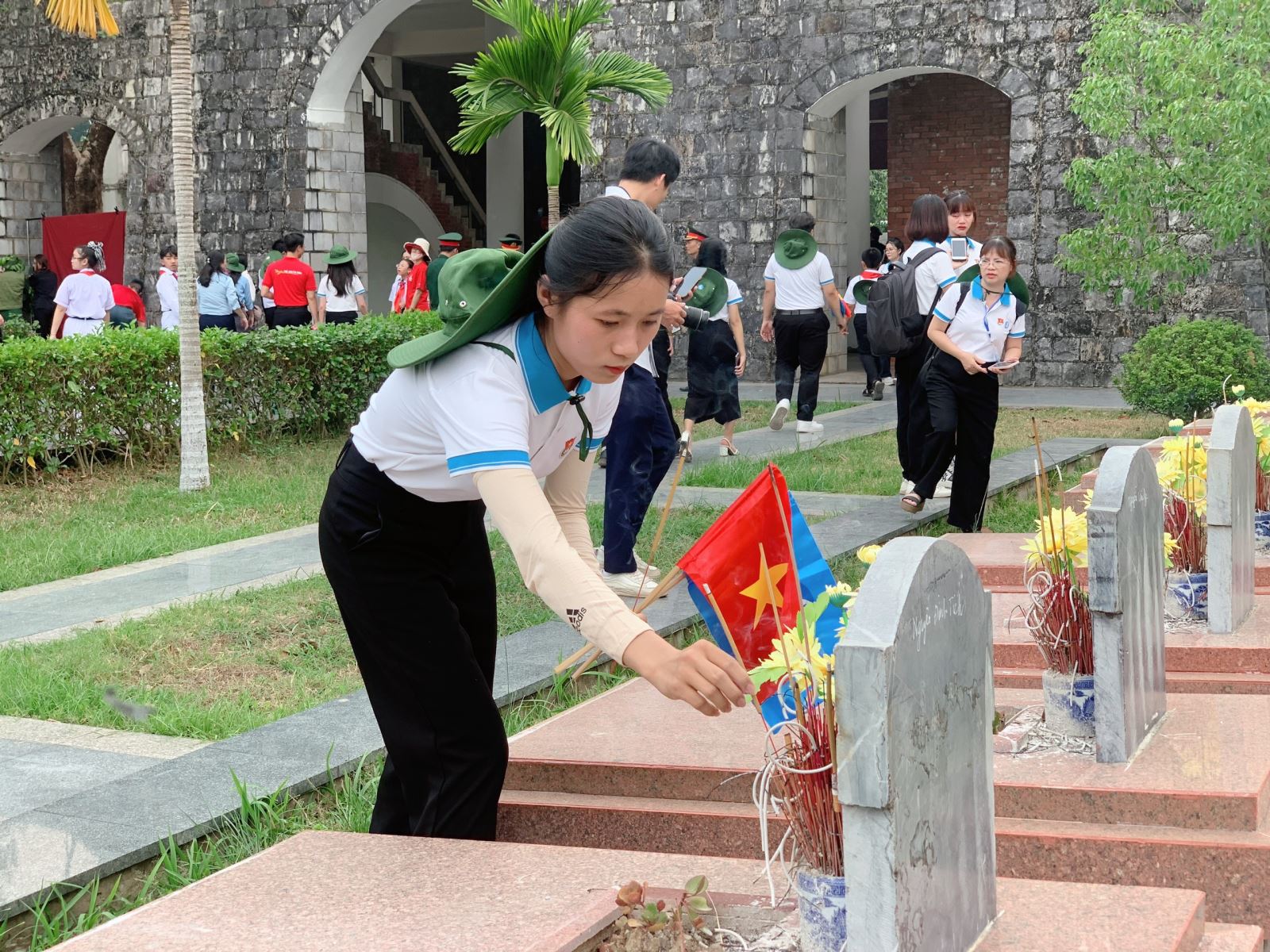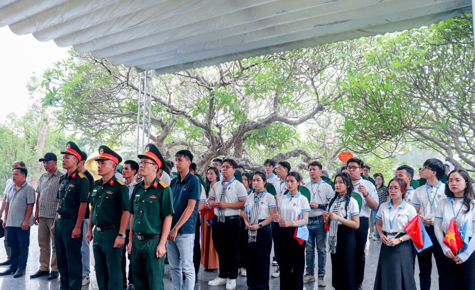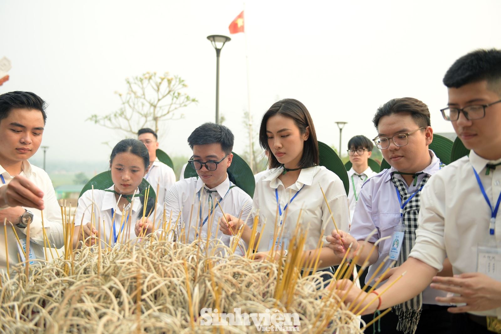 Chiều ngày 24/4, tại Đền thờ Liệt sĩ chiến trường Điện Biên Phủ, đoàn Hành trình 'Sinh viên với khát vọng non sông' tổ chức lễ dâng hương tưởng niệm các anh hùng liệt sĩ và đồng bào đã hy sinh trên mảnh đất Điện Biên anh hùng (sinh viên Bùi Thị Trà - đứng thứ 2 từ trái sang)