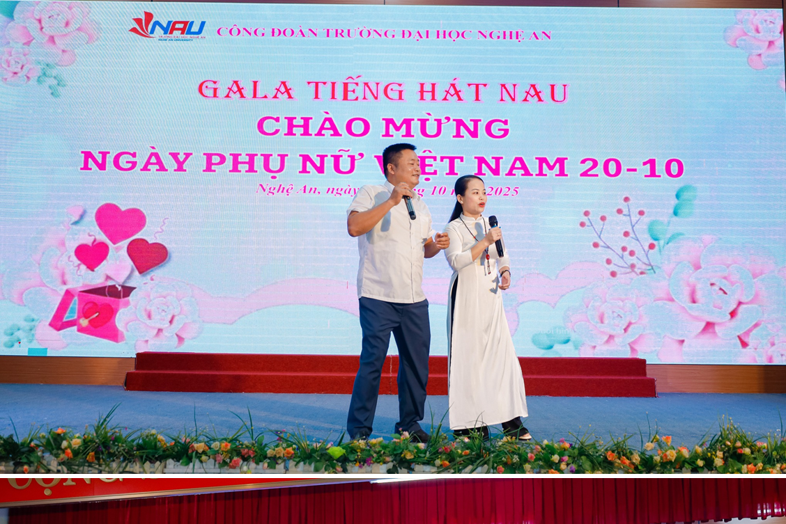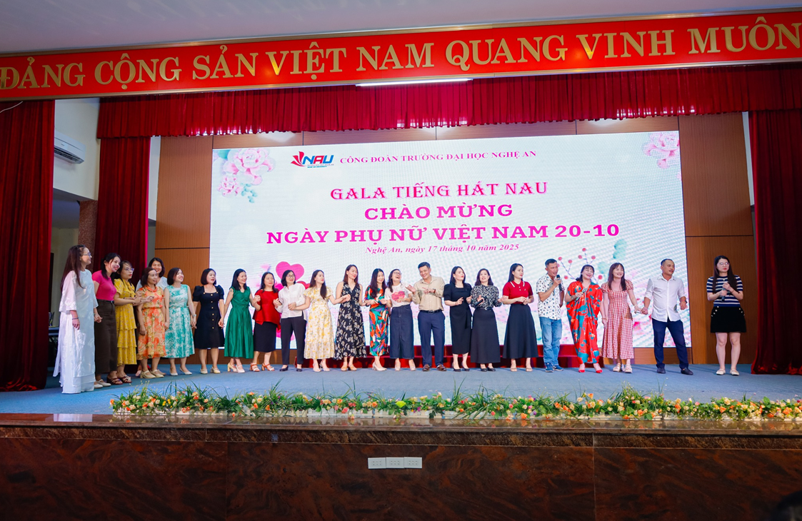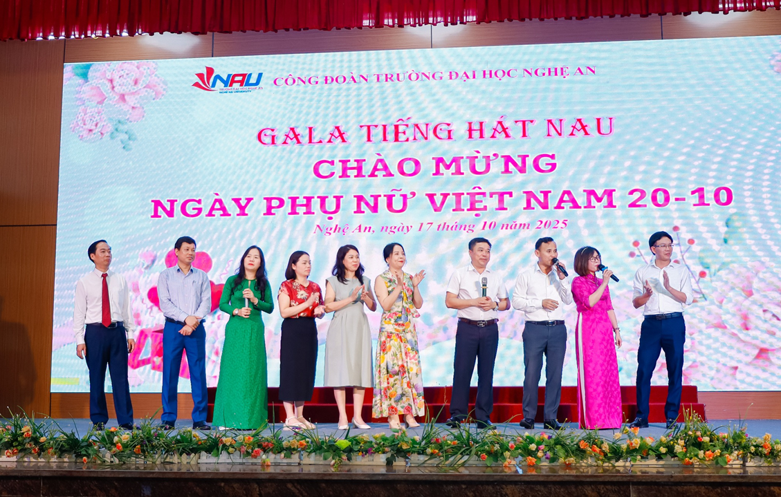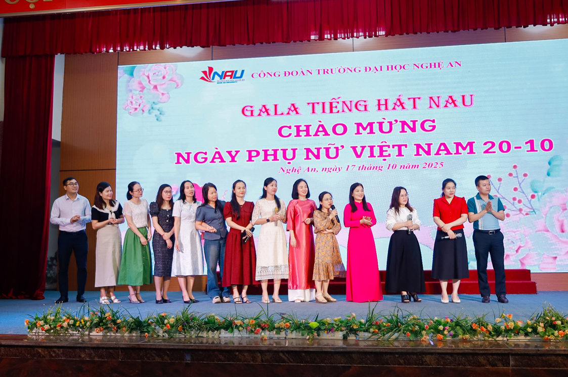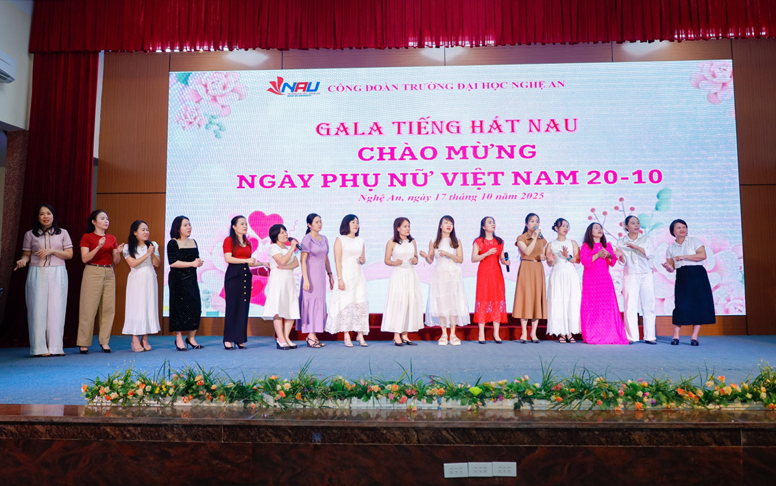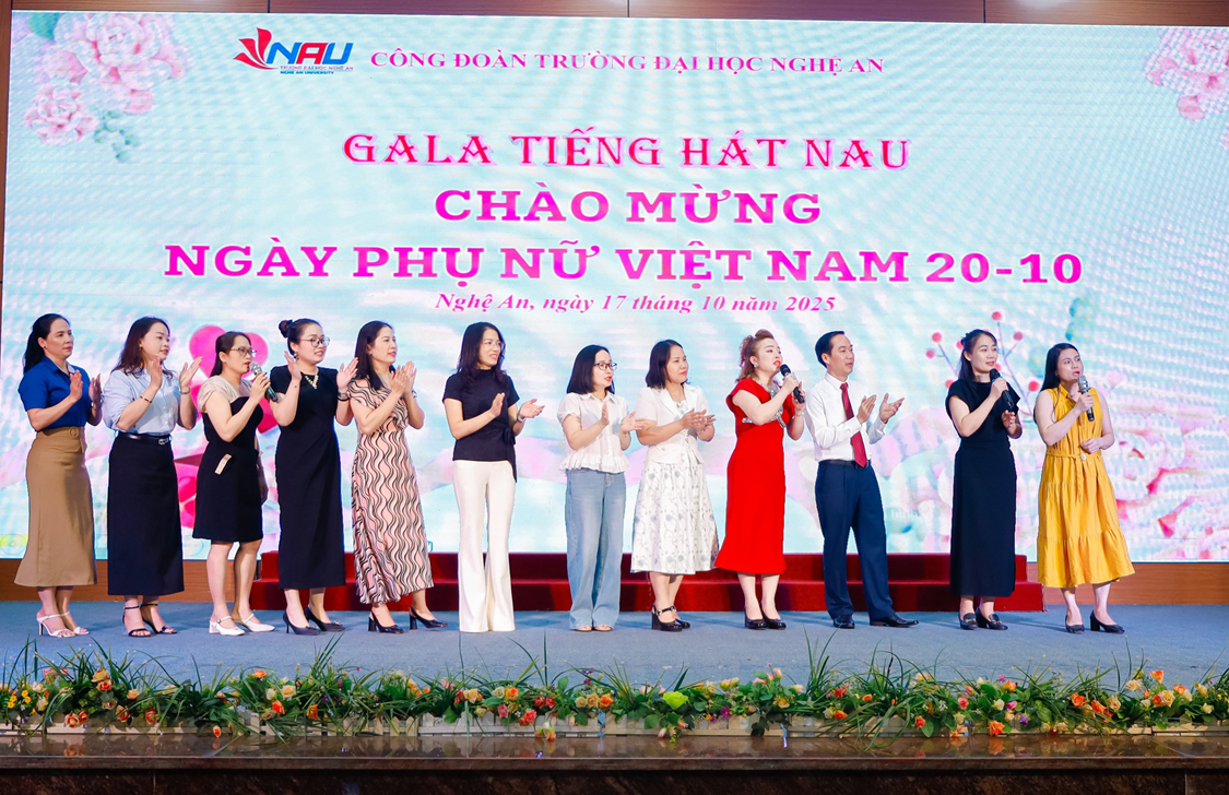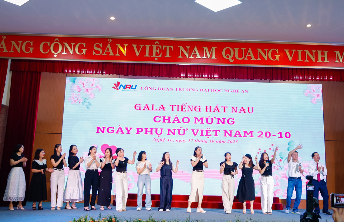 Nhằm chào mừng Ngày Phụ nữ Việt Nam 20/10 và tạo không khí vui tươi, gắn kết trong toàn thể cán bộ, giảng viên, người lao động, tối ngày 18 tháng 11 năm 2025, tại Hội trường A1, Công đoàn Trường Đại học Nghệ An đã tổ chức chương trình Gala “Tiếng hát NAU” - một sân chơi âm nhạc sôi động và đầy cảm xúc.