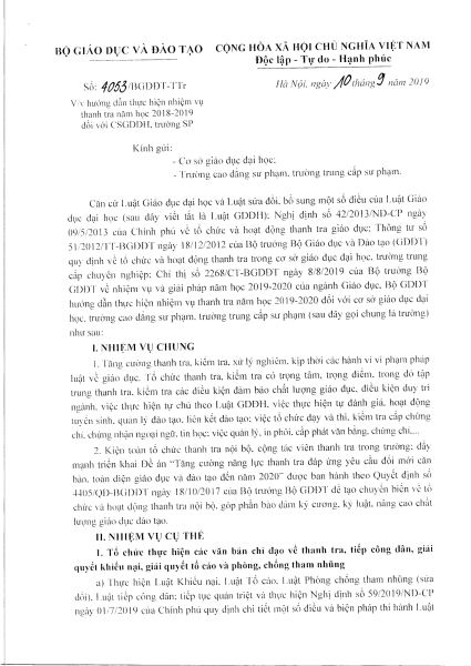 Công văn số 4053/BGDĐT-Ttr về việc hướng dẫn thực hiện nhiệm vụ thanh tra năm học 2019-2020 đối với CSGDDH, trường SP 17/09/2019 09:28 7824 lượt xem Dowload văn bản tại đây: