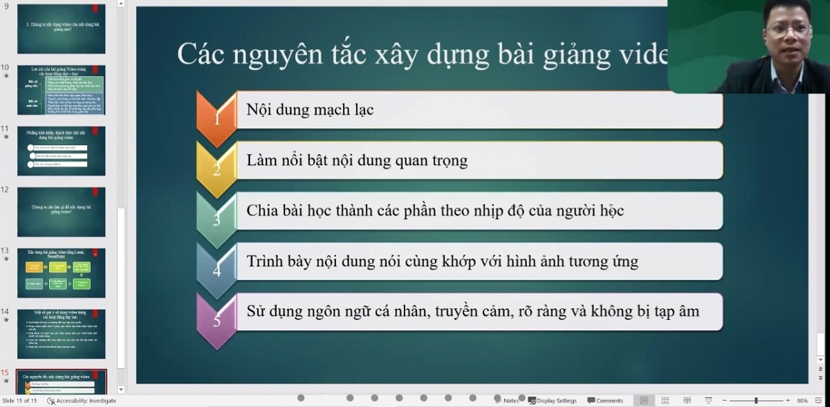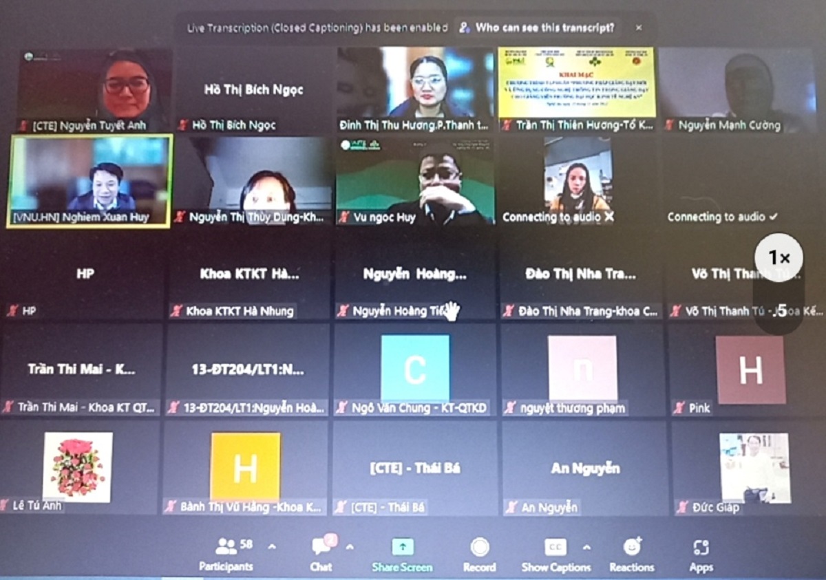 Thực hiện Chương trình tập huấn về phương pháp giảng dạy mới và ứng dụng công nghệ thông tin trong giảng dạy cho giảng viên Trường Đại học Kinh tế Nghệ An, chiều ngày 16 tháng 12 năm 2022, Trung tâm hỗ trợ giảng dạy - Viện Đảm bảo chất lượng giáo dục đã phối hợp với Trường Đại học Kinh tế Nghệ An tổ chức buổi seminar để hỗ trợ, tư vấn trực tiếp cho các học viên tham gia chương trình tập huấn. Tham gia buổi seminar, về phía Viện Đảm bảo chất lượng giáo dục - ĐHQGHN có TS. Nghiêm Xuân Huy - Viện trưởng, cùng các giảng viên tham gia quản lý, tư vấn, hỗ trợ tập huấn từ Trung tâm hỗ trợ giảng dạy. Về phía Trường Đại học Kinh tế Nghệ An có hơn 100 giảng viên tham dự trực tuyến qua phòng học zoom.