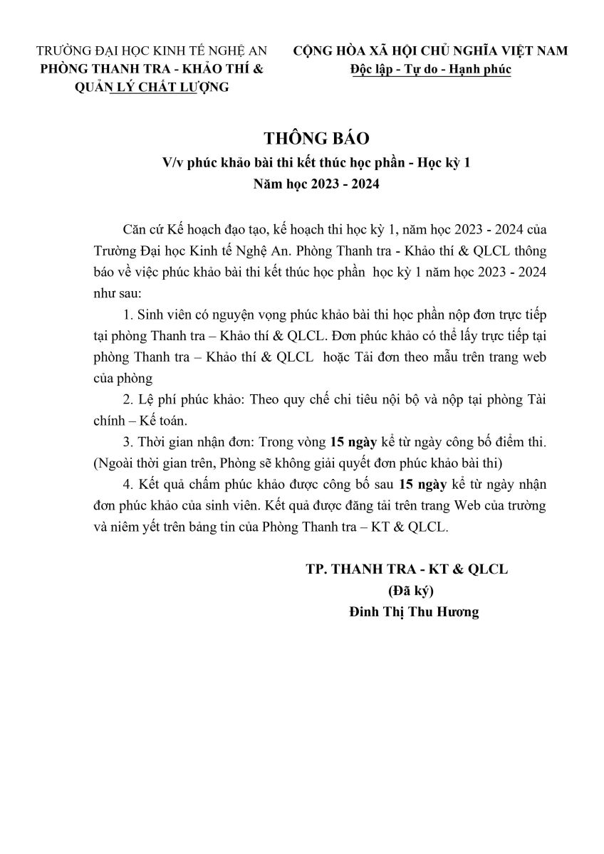 Thông báo phúc khảo bài thi kết thúc học phần - Học kỳ 1 Năm học 2023 - 2024 31/01/2024 02:52 4135 lượt xem